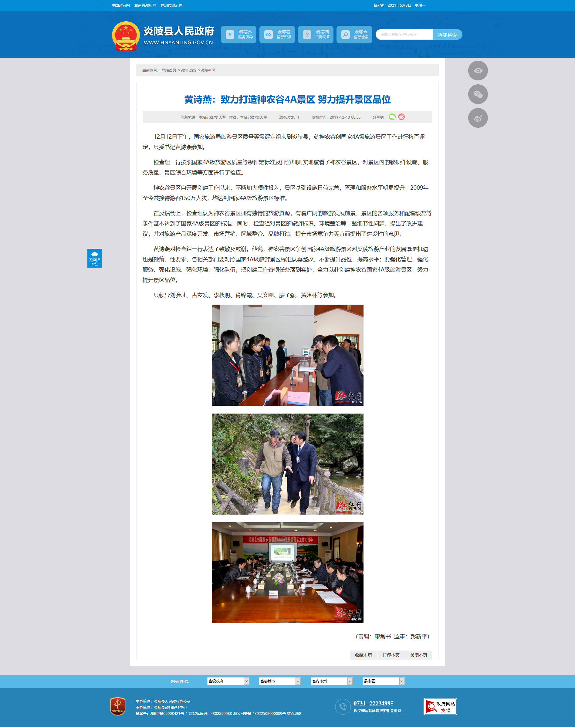 黄诗燕对检查组一行表达了致敬及致谢。他说,神农谷景区争创国家4A级旅游景区对炎陵旅游产业的发展既是机遇也是鞭策。他要求,各相关部门要对照国家4A级旅游景区标准认真整改,不断提升品位、提高水平;要强化管理、强化服务、强化设施、强化环境、强化队伍,把创建工作各项任务落到实处,全力以赴创建神农谷国家4A级旅游景区,努力提升景区品位。