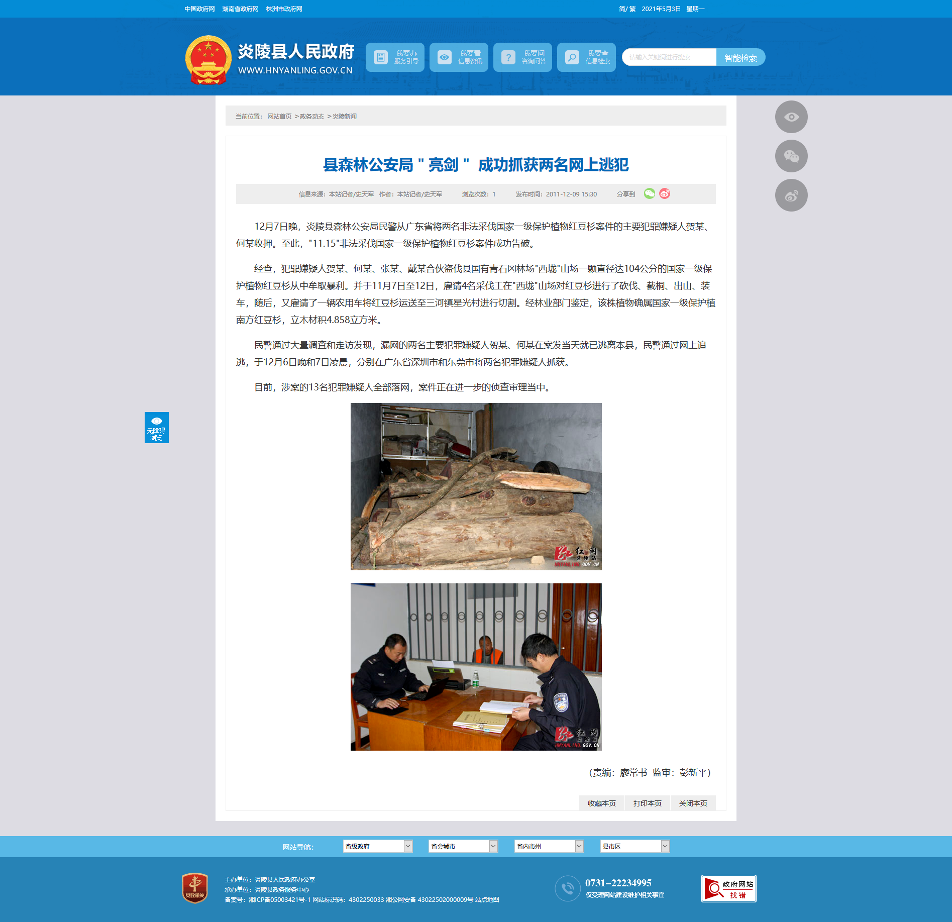12月7日晚,炎陵县森林公安局民警从广东省将两名非法采伐国家一级保护植物红豆杉案件的主要犯罪嫌疑人贺某、何某收押。至此,"11.15"非法采伐国家一级保护植物红豆杉案件成功告破。