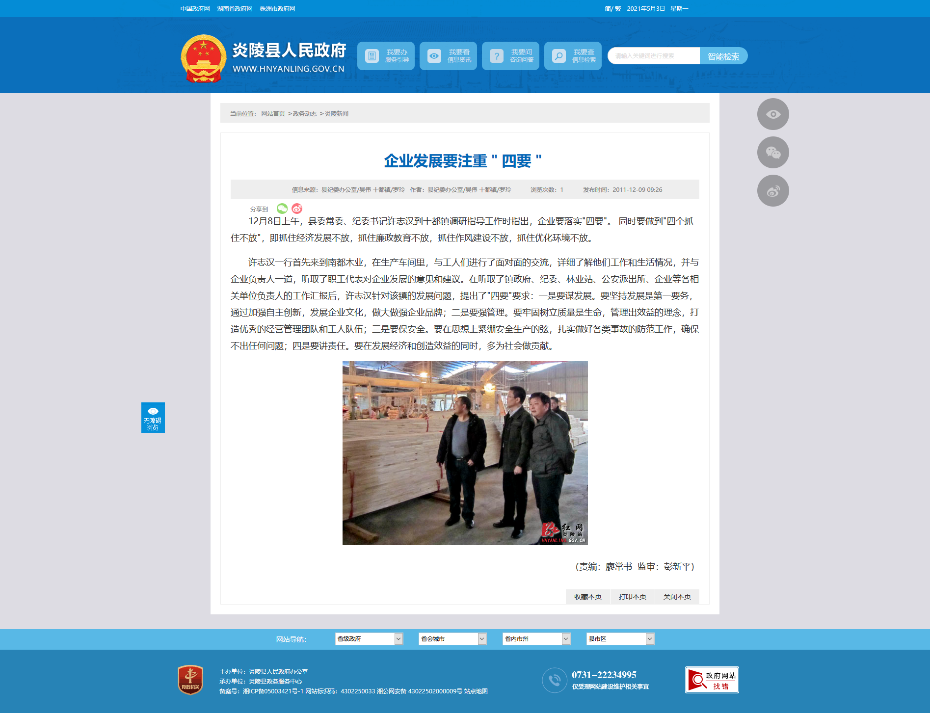 许志汉一行首先来到南都木业,在生产车间里,与工人们进行了面对面的交流,详细了解他们工作和生活情况,并与企业负责人一道,听取了职工代表对企业发展的意见和建议。在听取了镇政府、纪委、林业站、公安派出所、企业等各相关单位负责人的工作汇报后,许志汉针对该镇的发展问题,提出了"四要"要求:一是要谋发展。要坚持发展是第一要务,通过加强自主创新,发展企业文化,做大做强企业品牌;二是要强管理。要牢固树立质量是生命,管理出效益的理念,打造优秀的经营管理团队和工人队伍;三是要保安全。要在思想上紧绷安全生产的弦,扎实做好各类事故的防范工作,确保不出任何问题;四是要讲责任。要在发展经济和创造效益的同时,多为社会做贡献。
