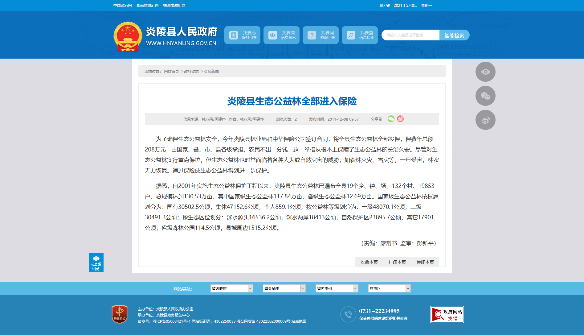 为了确保生态公益林安全,今年炎陵县林业局和中华保险公司签订合同,将全县生态公益林全部投保,保费年总额208万元,由国家、省、市、县各级承担,农民不出一分钱,这一举措从根本上保障了生态公益林的长治久安。尽管对生态公益林实行重点保护,但生态公益林也时常面临着各种人为或自然灾害的威胁,如森林火灾、雪灾等,一旦受害,林农无力恢复。通过保险使生态公益林得到进一步保护。