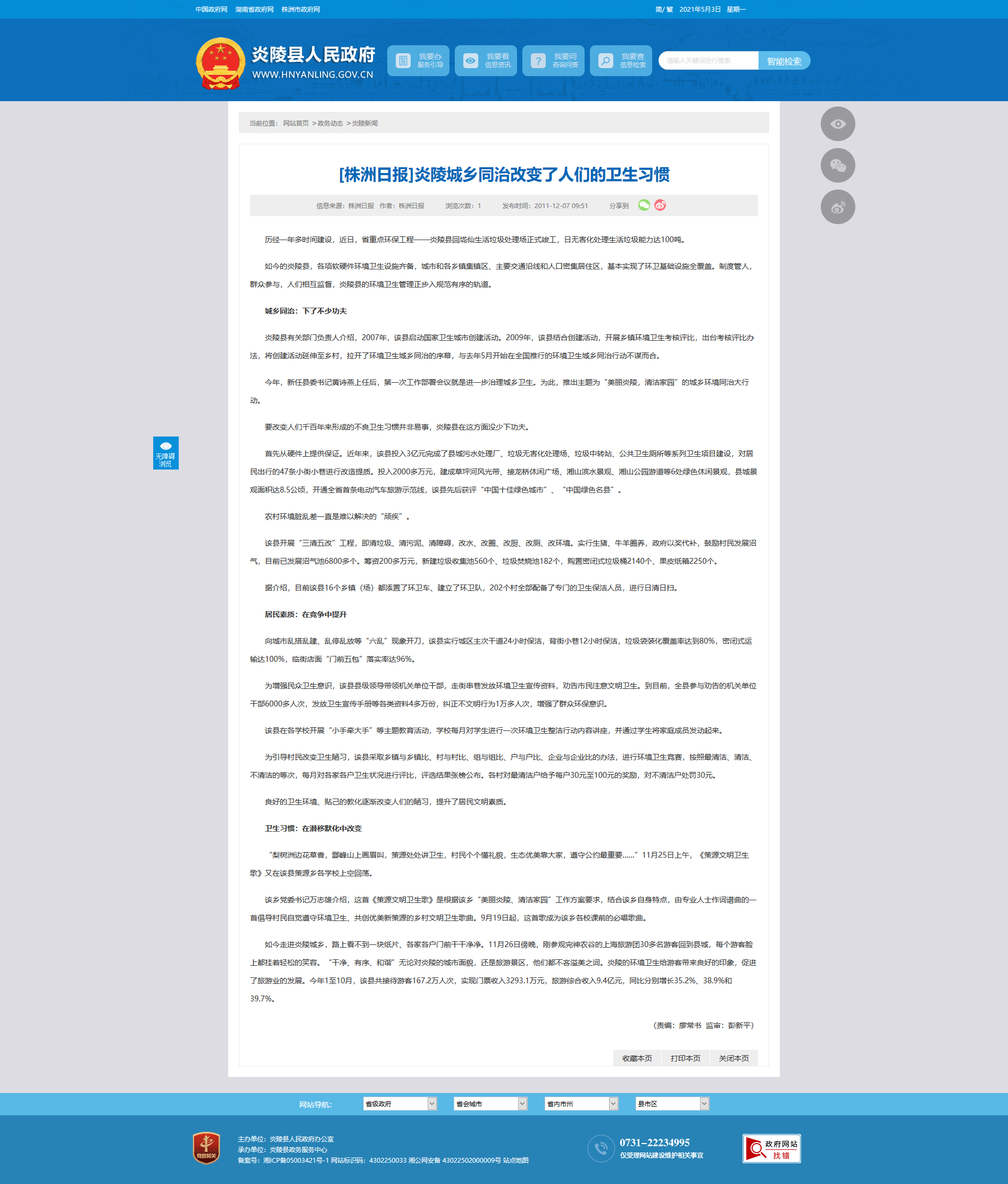 如今的炎陵县,各项软硬件环境卫生设施齐备,城市和各乡镇集镇区、主要交通沿线和人口密集居住区,基本实现了环卫基础设施全覆盖。制度管人,群众参与,人们相互监督,炎陵县的环境卫生管理正步入规范有序的轨道。