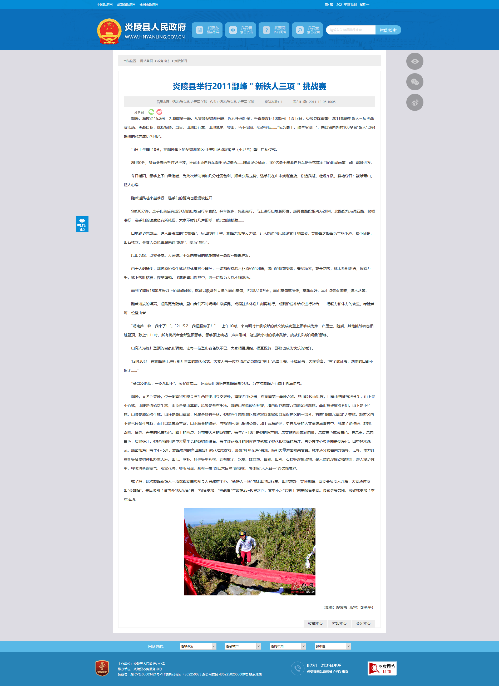 酃峰,海拔2115.2米,为湖南第一峰。从策源梨树洲登峰,近30千米距离,垂直高度达1000米!12月3日,炎陵县隆重举行2011酃峰新铁人三项挑战赛活动,挑战自我,挑战极限。当日,山地自行车、山地跑步、登山,马不停蹄,疾步登顶……"我为勇士,谁与争锋!",来自省内外的100多名"铁人"以钢铁般的意志成功"征服"。