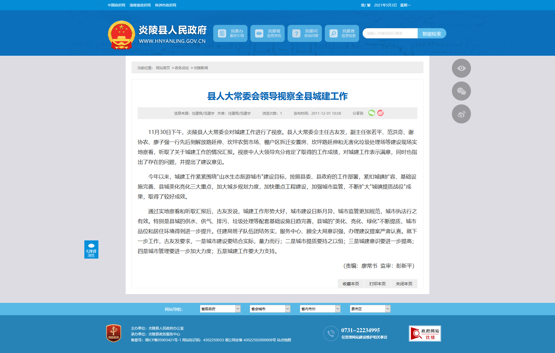 通过实地察看和听取汇报后,古友发说,城建工作形势大好,城市建设日新月异,城市监管更加规范,城市执法行之有效。特别是县城的供水、供气、排污、垃圾处理等配套基础设施日趋完善,县城的"美化、亮化、绿化"不断提质,城市品位和居住环境得到进一步提升。住建局班子队伍团结务实,服务中心、顾全大局意识强,办理建议提案严肃认真。就下一步工作,古友发要求,一是城市建设要结合实际,量力而行;二是城市提质要持之以恒;三是城建意识要进一步提高;四是城市管理要进一步加大力度;五是城建工作要大力支持。