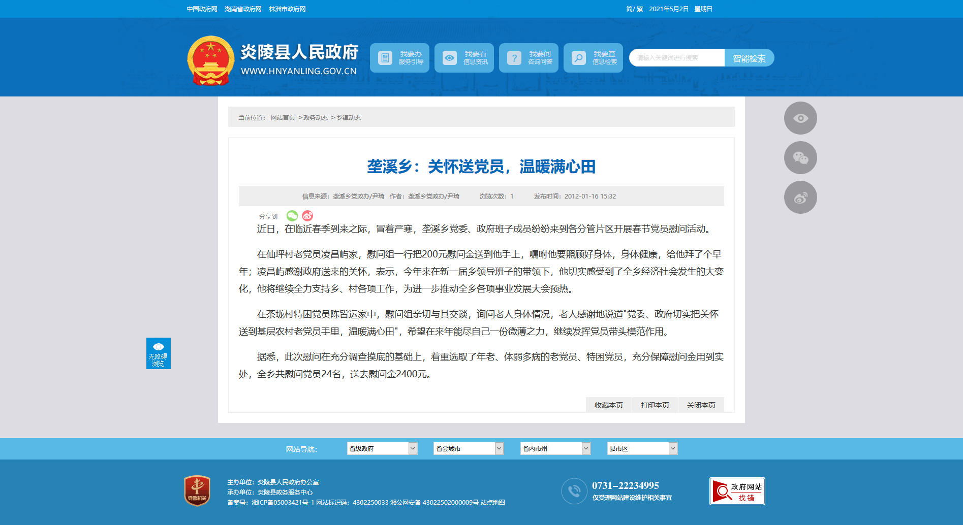 在仙坪村老党员凌昌屿家,慰问组一行把200元慰问金送到他手上,嘱咐他要照顾好身体,身体健康,给他拜了个早年;凌昌屿感谢政府送来的关怀,表示,今年来在新一届乡领导班子的带领下,他切实感受到了全乡经济社会发生的大变化,他将继续全力支持乡、村各项工作,为进一步推动全乡各项事业发展大会预热。