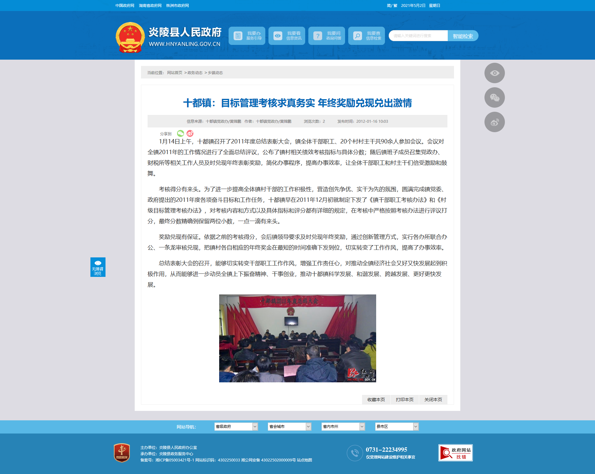 1月14日上午,十都镇召开了2011年度总结表彰大会,镇全体干部职工、20个村村主干共90余人参加会议。会议对全镇2011年的工作情况进行了全面总结评议,公布了镇村相关绩效考核指标与具体分数;随后镇班子成员召集党政办、财税所等相关工作人员及时兑现年终表彰奖励,简化办事程序,提高办事效率,让全体干部职工和村主干们倍受激励和鼓舞。