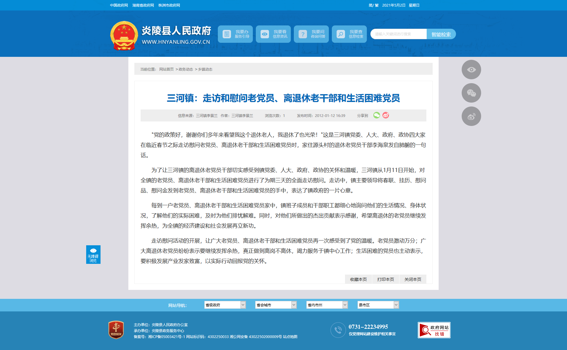 为了让三河镇的离退休老党员干部切实感受到镇党委、人大、政府、政协的关怀和温暖,三河镇从1月11日开始,对全镇的老党员、离退休老干部和生活困难党员进行了为期三天的全面走访慰问。走访中,镇主要领导将春联、挂历、慰问品、慰问金发到老党员、离退休老干部和生活困难党员的手中,表达了镇政府的一片心意。