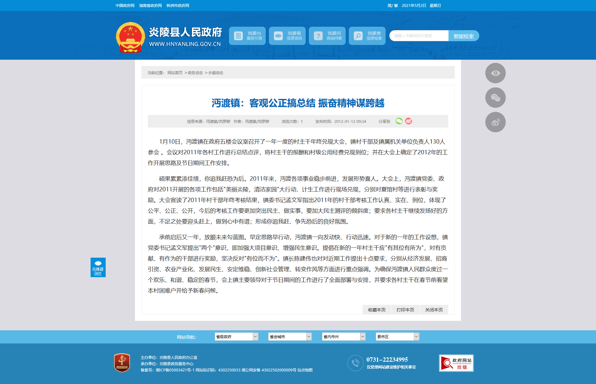 1月10日,沔渡镇在政府五楼会议室召开了一年一度的村主干年终兑现大会,镇村干部及镇属机关单位负责人130人参会 。会议对2011年各村工作进行总结点评,将村主干的报酬和村级公用经费兑现到位;并在大会上确定了2012年的工作开展思路及节日期间工作安排。