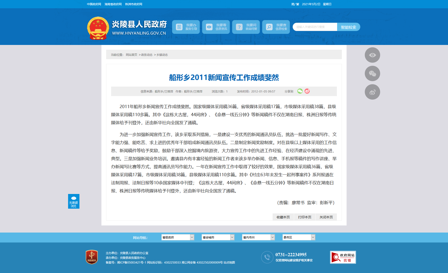 2011年船形乡新闻宣传工作成绩斐然。国家级媒体采用稿36篇,省级媒体采用稿17篇,市级媒体采用稿38篇,县级媒体采用稿110多篇。其中《这栋大古屋,44间房》、《命悬一线五分钟》等新闻稿件不仅在湖南日报、株洲日报等传统媒体给予刊登外,还由新华社向全国发了通稿。