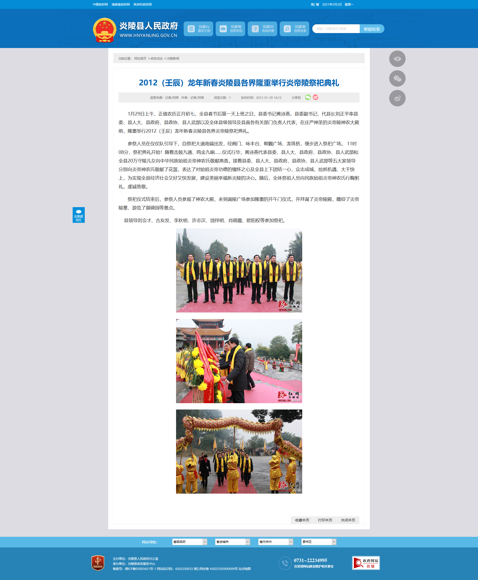 1月29日上午,正值农历正月初七,全县春节后第一天上班之日,县委书记黄诗燕,县委副书记、代县长刘正平率县委、县人大、县政府、县政协、县人武部以及全体县级领导及县直各有关部门负责人代表,在庄严神圣的炎帝陵神农大殿前,隆重举行2012(壬辰)龙年新春炎陵县各界炎帝陵祭祀典礼。