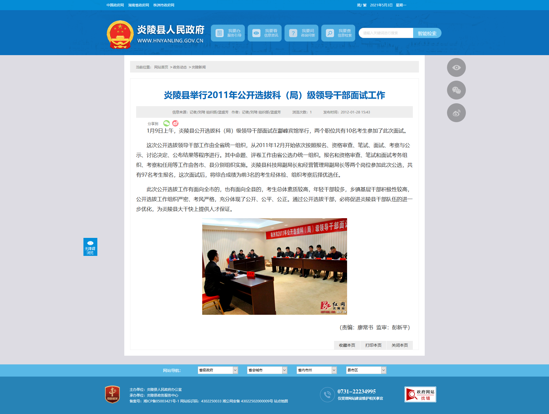 1月9日上午,炎陵县公开选拔科(局)级领导干部面试在酃峰宾馆举行,两个职位共有10名考生参加了此次面试。