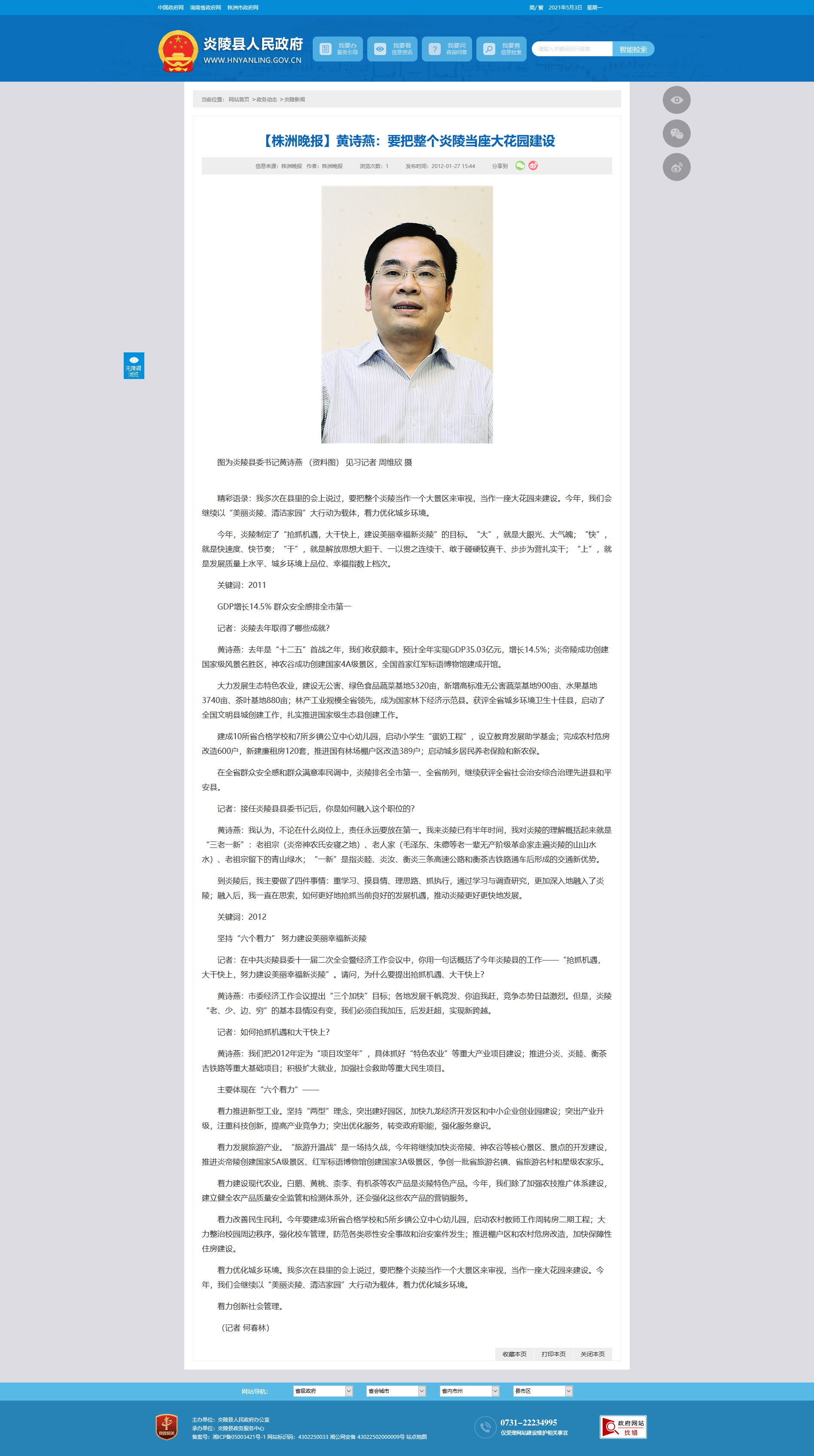 精彩语录:我多次在县里的会上说过,要把整个炎陵当作一个大景区来审视,当作一座大花园来建设。今年,我们会继续以“美丽炎陵、清洁家园”大行动为载体,着力优化城乡环境。