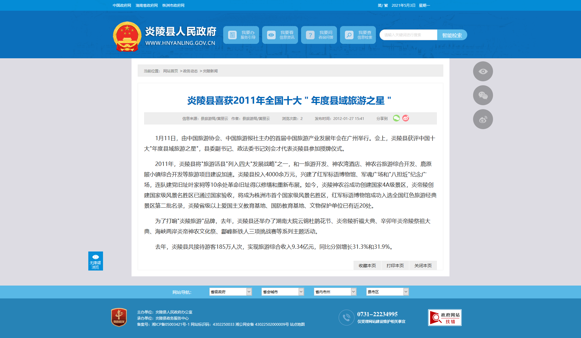 去年,炎陵县共接待游客185万人次,实现旅游综合收入9.34亿元,同比分别增长31.3%和31.9%。