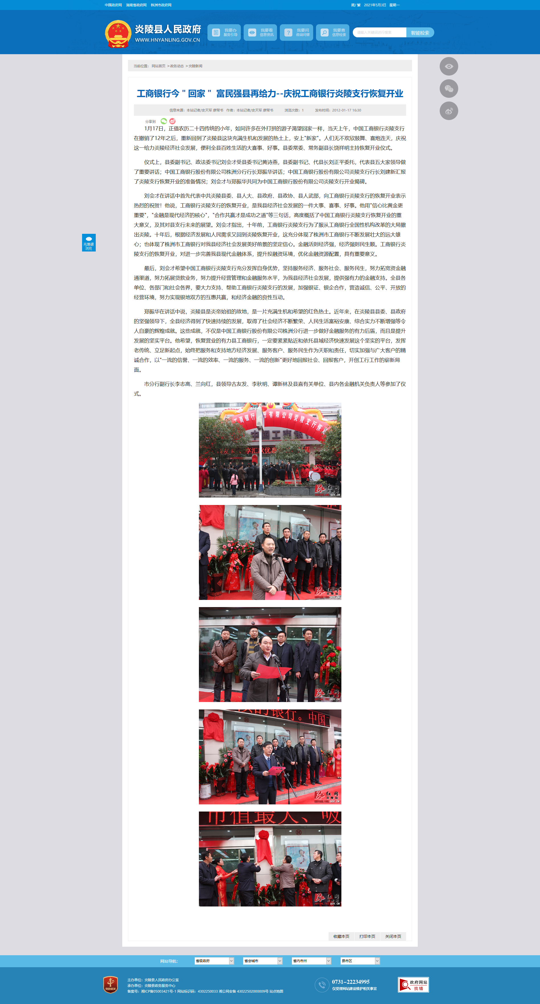 1月17日,正值农历二十四传统的小年,如同许多在外打拼的游子渴望回家一样,当天上午,中国工商银行炎陵支行在撤销了12年之后,重新回到了炎陵县这块充满生机和发展的热土上,安上"新家"。人们无不欢欣鼓舞、喜炮连天,庆祝这一给力炎陵经济社会发展,便利全县百姓生活的大喜事、好事。县委常委、常务副县长饶祥明主持恢复开业仪式。