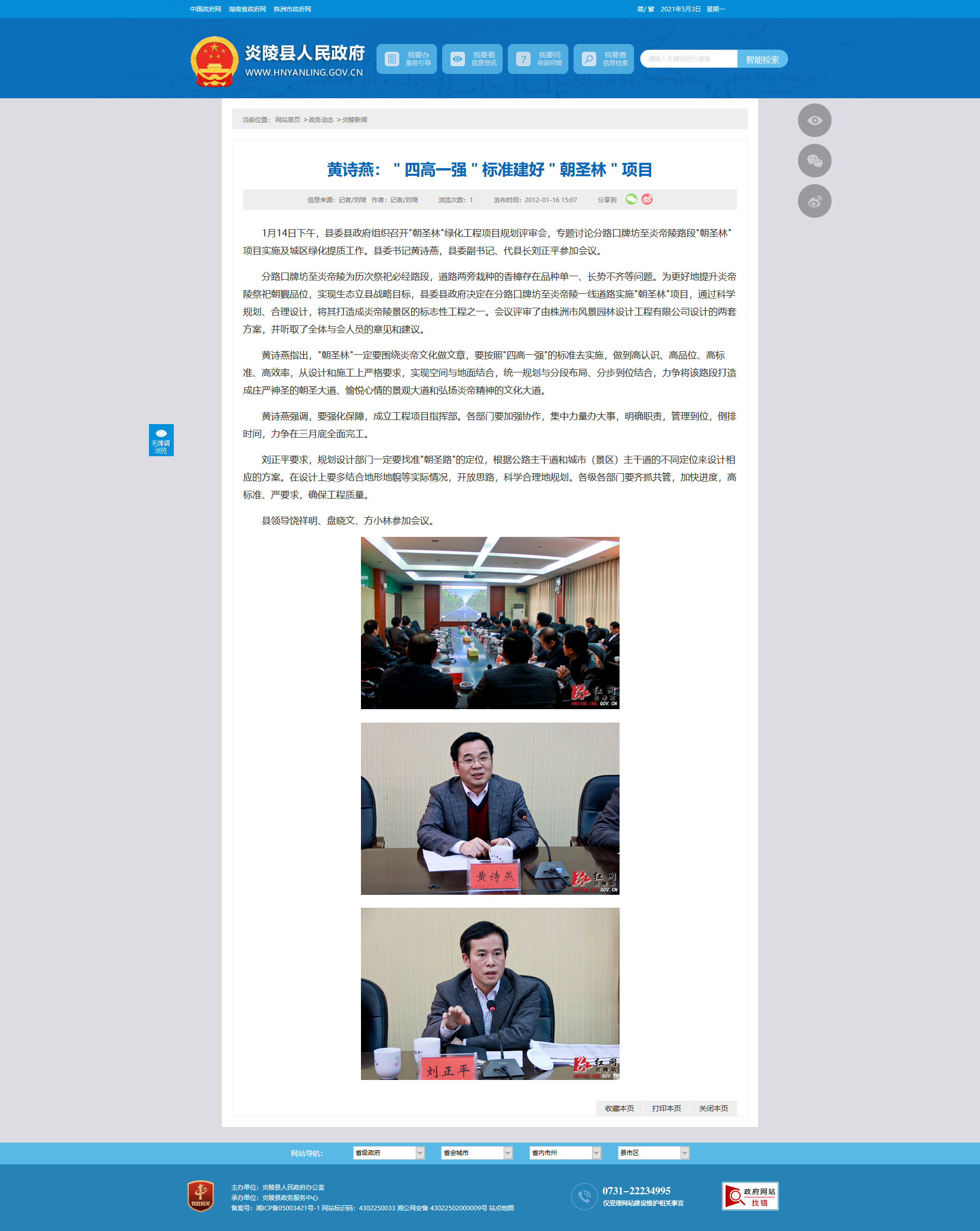 1月14日下午,县委县政府组织召开"朝圣林"绿化工程项目规划评审会,专题讨论分路口牌坊至炎帝陵路段"朝圣林"项目实施及城区绿化提质工作。县委书记黄诗燕,县委副书记、代县长刘正平参加会议。