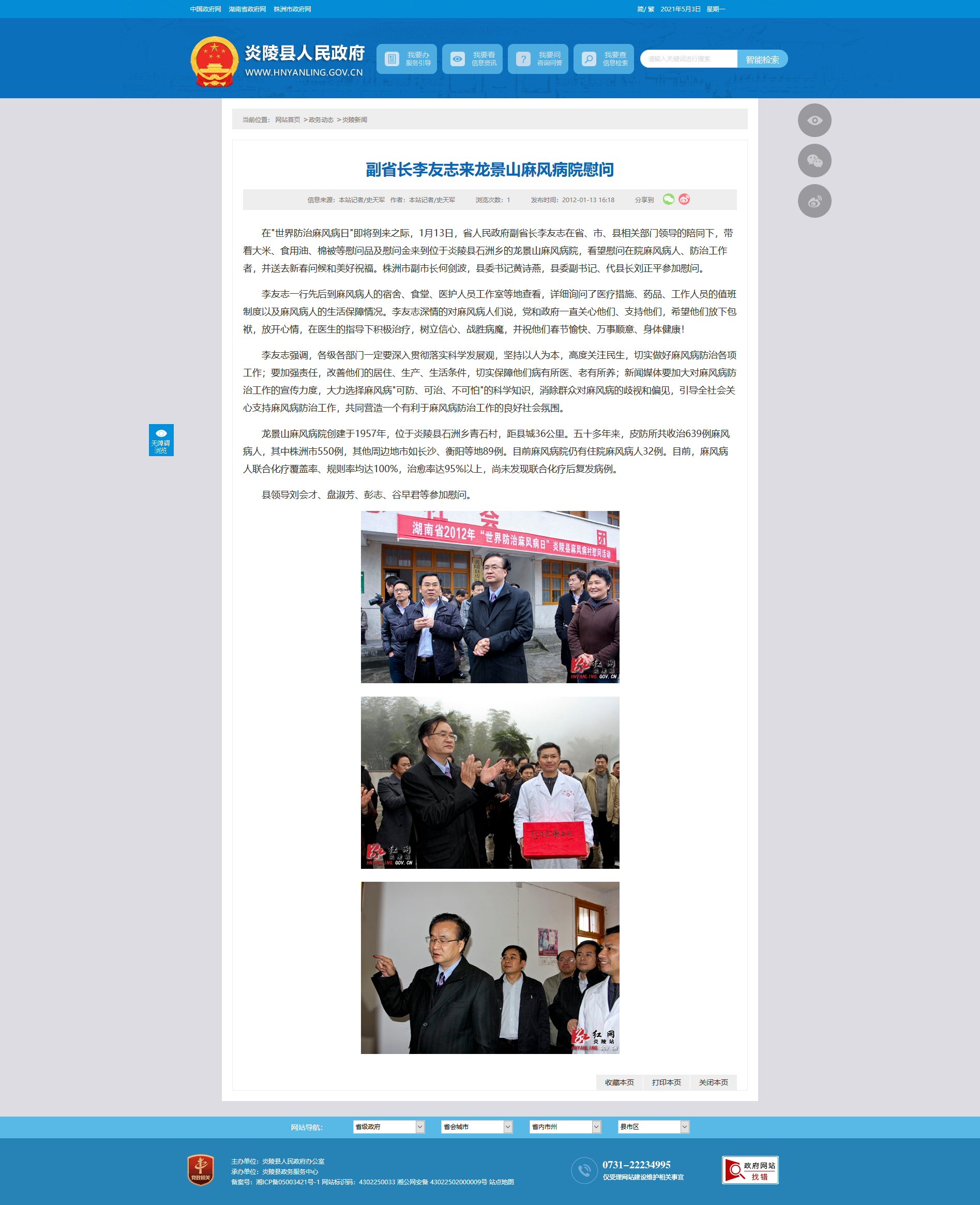 在"世界防治麻风病日"即将到来之际,1月13日,省人民政府副省长李友志在省、市、县相关部门领导的陪同下,带着大米、食用油、棉被等慰问品及慰问金来到位于炎陵县石洲乡的龙景山麻风病院,看望慰问在院麻风病人、防治工作者,并送去新春问候和美好祝福。株洲市副市长何剑波,县委书记黄诗燕,县委副书记、代县长刘正平参加慰问。