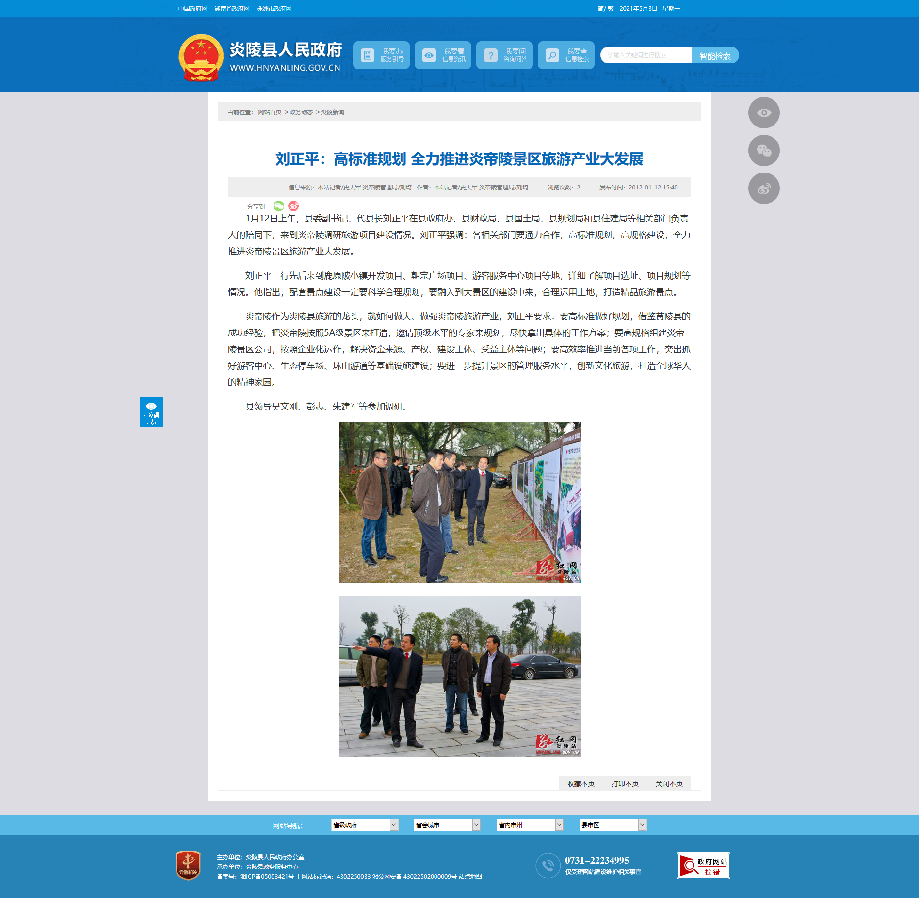 1月12日上午,县委副书记、代县长刘正平在县政府办、县财政局、县国土局、县规划局和县住建局等相关部门负责人的陪同下,来到炎帝陵调研旅游项目建设情况。刘正平强调:各相关部门要通力合作,高标准规划,高规格建设,全力推进炎帝陵景区旅游产业大发展。