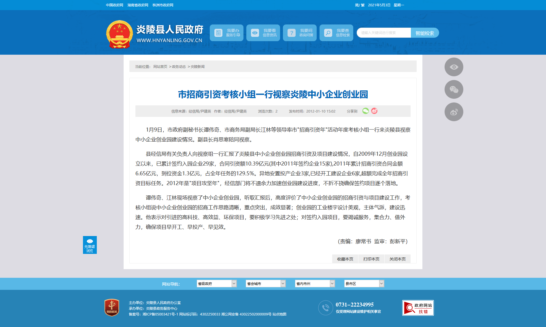 县经信局有关负责人向视察组一行汇报了炎陵县中小企业创业园招商引资及项目建设情况,自2009年12月创业园设立以来,已累计签约入园企业29家,合同引资额10.39亿元(其中2011年签约企业15家),2011年累计招商引资合同金额6.65亿元,到位资金1.3亿元,占全年任务的129.5%。异地安置投产企业3家,已经开工建设企业6家,超额完成全年招商引资目标任务。2012年是"项目攻坚年",经信部门将不遗余力加速创业园建设进度,不折不挠确保签约项目逐个落地。