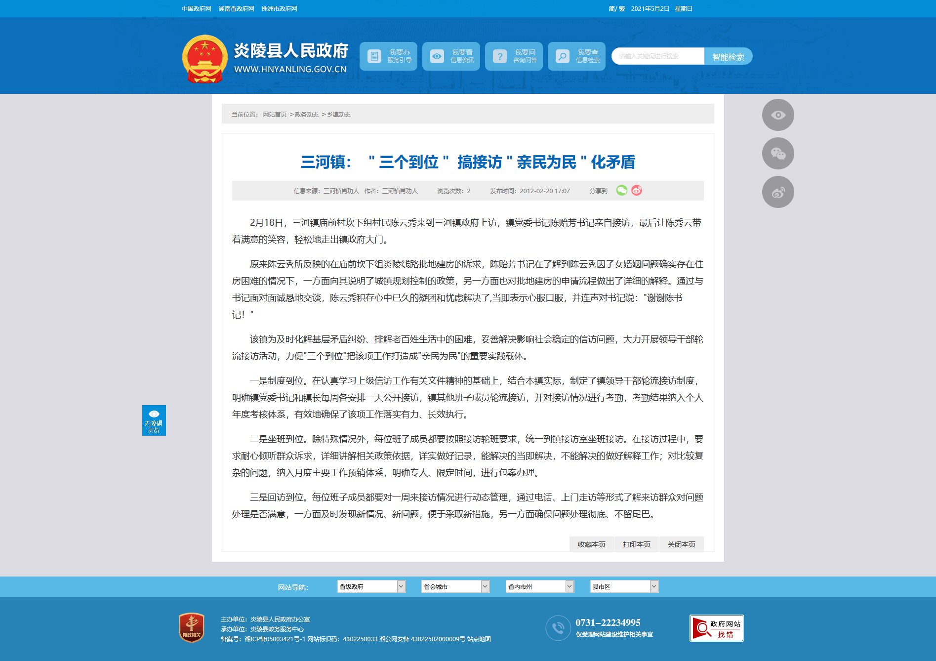 2月18日,三河镇庙前村坎下组村民陈云秀来到三河镇政府上访,镇党委书记陈贻芳书记亲自接访,最后让陈秀云带着满意的笑容,轻松地走出镇政府大门。