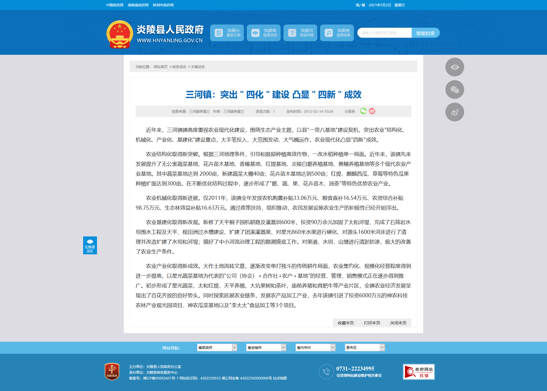 农业结构化取得新突破。根据三河地理条件,引导和鼓励种植高效作物,一改水稻种植单一局面。近年来,该镇先来发展提升了无公害蔬菜基地、花卉苗木基地、香椿基地、红提基地、炎陵白鹅养殖基地、黄鳝养殖基地等多个现代农业产业基地。其中蔬菜基地达到 2000亩,新建蔬菜大棚40亩;花卉苗木基地达到500亩;红提、麒麟西瓜、草莓等特色瓜果种植扩面达到300亩。在不断优化结构过程中,逐步形成了"鹅、蔬、果、花卉苗木、油茶"等特色优势农业产业。
