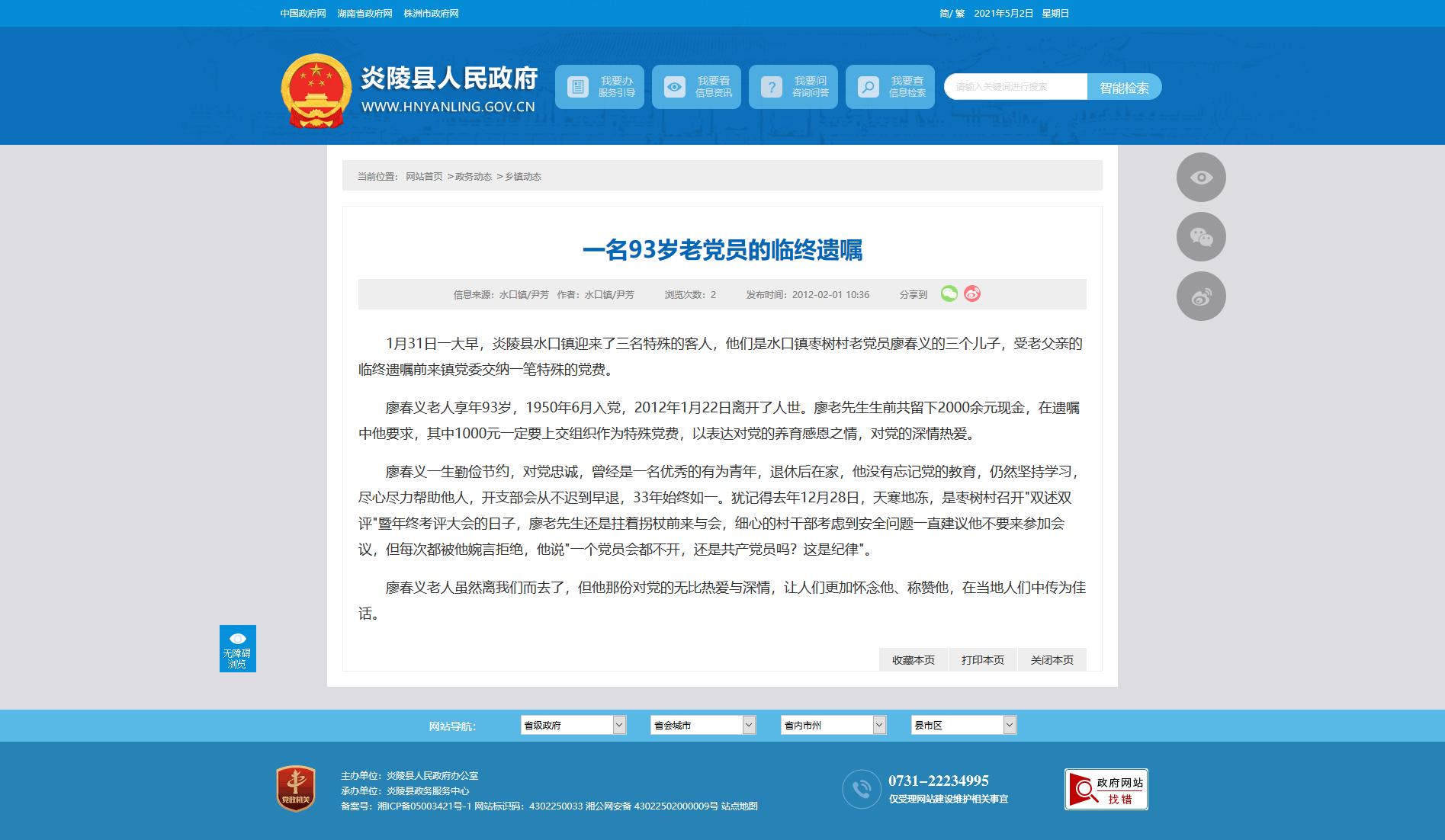 廖春义老人享年93岁,1950年6月入党,2012年1月22日离开了人世。廖老先生生前共留下2000余元现金,在遗嘱中他要求,其中1000元一定要上交组织作为特殊党费,以表达对党的养育感恩之情,对党的深情热爱。