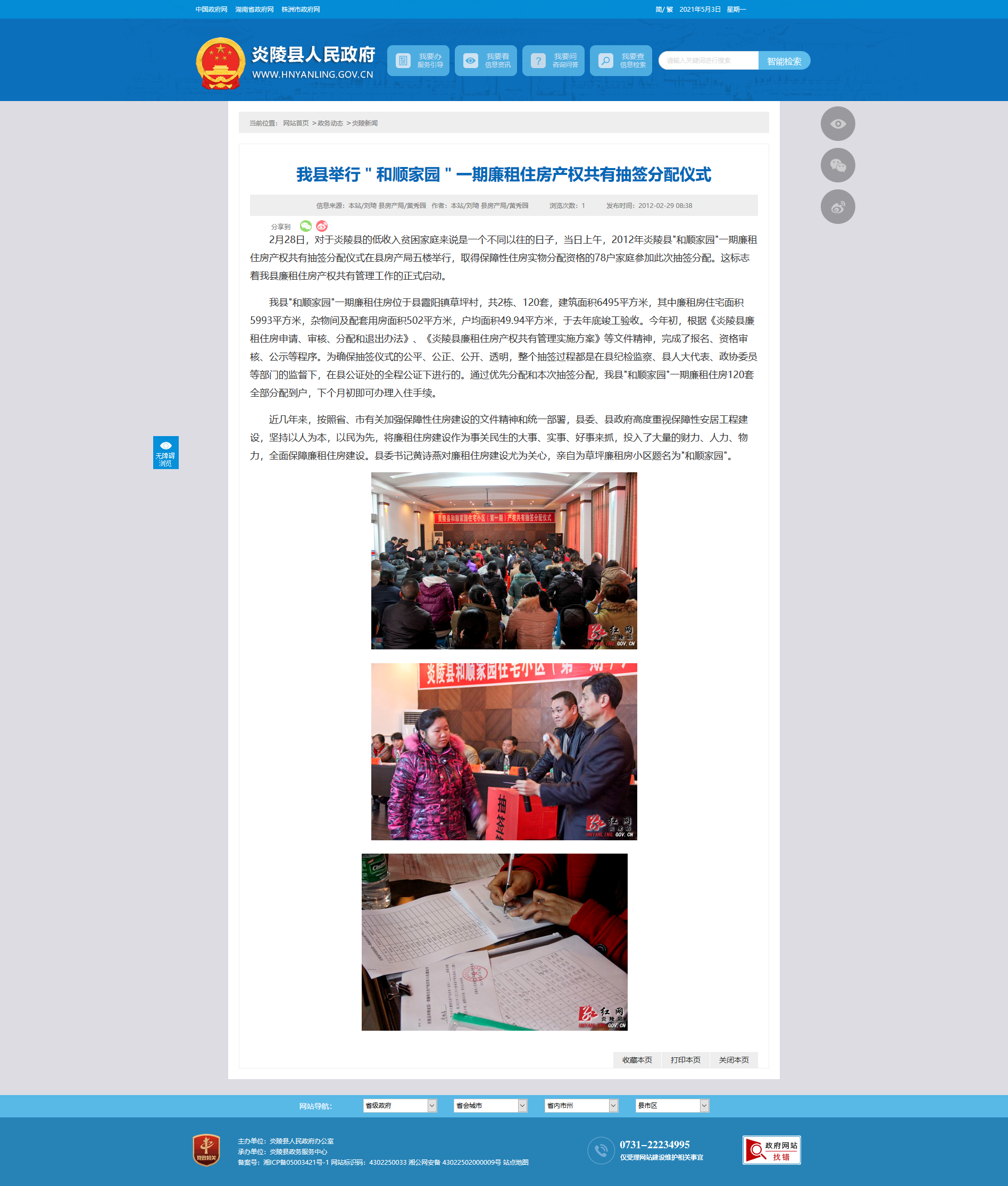 2月28日,对于炎陵县的低收入贫困家庭来说是一个不同以往的日子,当日上午,2012年炎陵县"和顺家园"一期廉租住房产权共有抽签分配仪式在县房产局五楼举行,取得保障性住房实物分配资格的78户家庭参加此次抽签分配。这标志着我县廉租住房产权共有管理工作的正式启动。