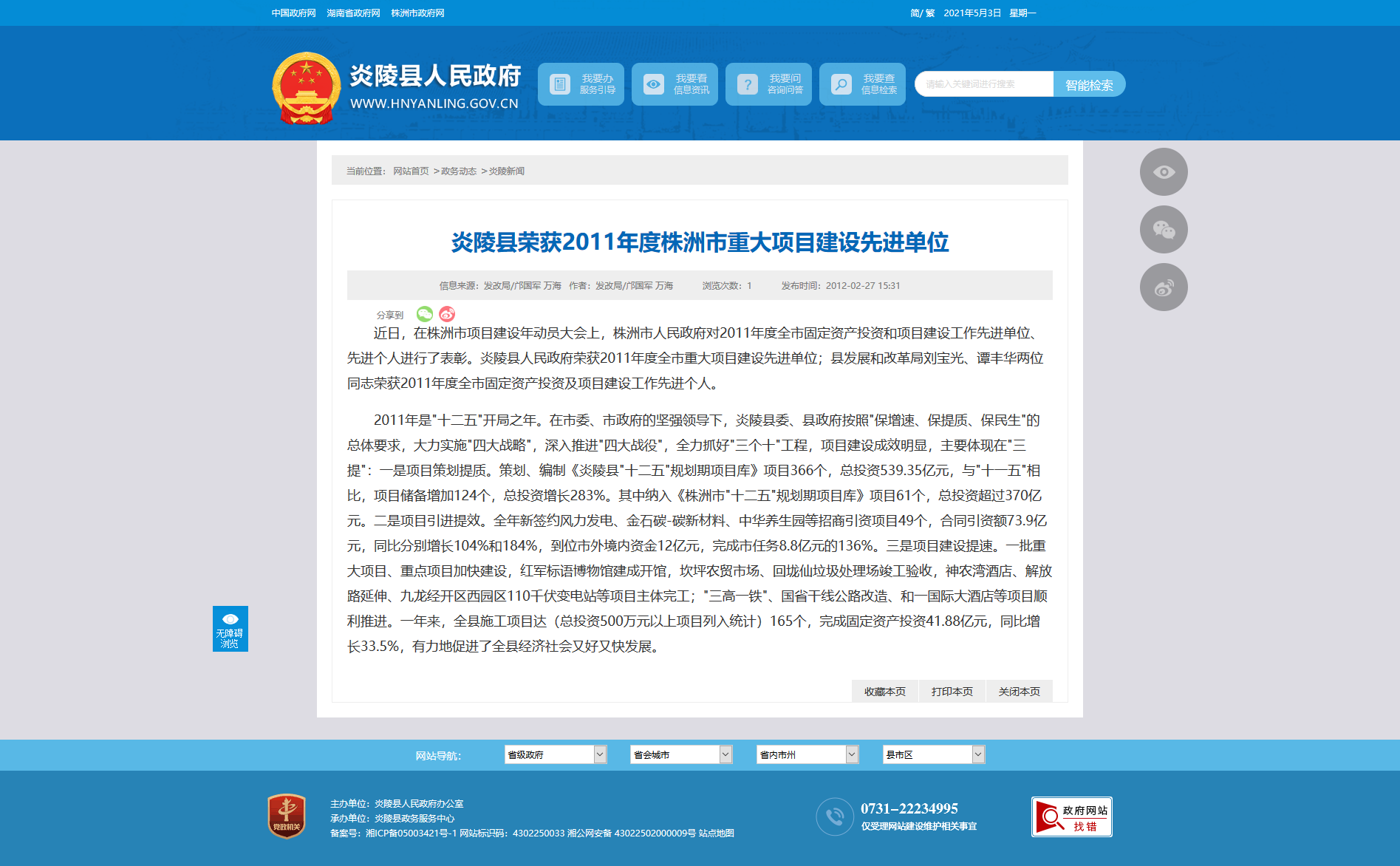近日,在株洲市项目建设年动员大会上,株洲市人民政府对2011年度全市固定资产投资和项目建设工作先进单位、先进个人进行了表彰。炎陵县人民政府荣获2011年度全市重大项目建设先进单位;县发展和改革局刘宝光、谭丰华两位同志荣获2011年度全市固定资产投资及项目建设工作先进个人。