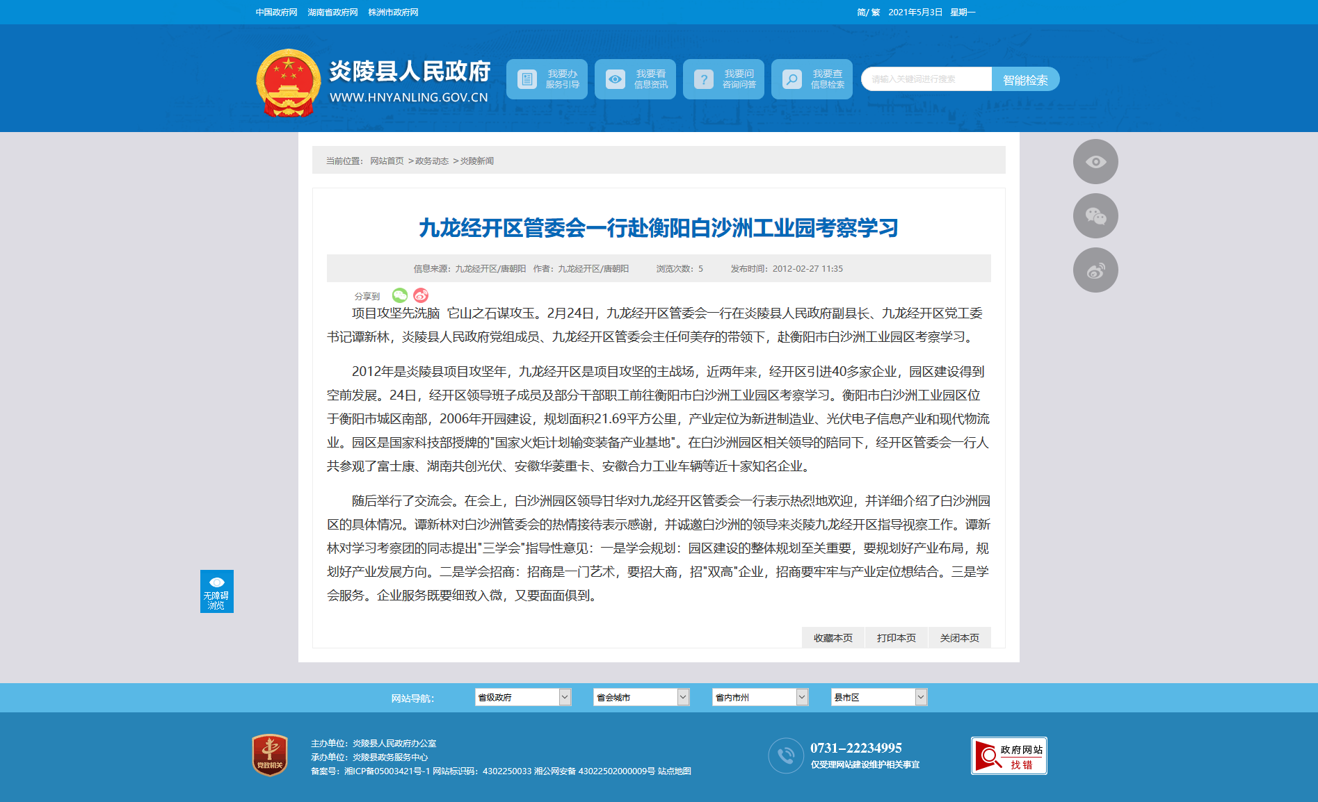 2012年是炎陵县项目攻坚年,九龙经开区是项目攻坚的主战场,近两年来,经开区引进40多家企业,园区建设得到空前发展。24日,经开区领导班子成员及部分干部职工前往衡阳市白沙洲工业园区考察学习。衡阳市白沙洲工业园区位于衡阳市城区南部,2006年开园建设,规划面积21.69平方公里,产业定位为新进制造业、光伏电子信息产业和现代物流业。园区是国家科技部授牌的"国家火炬计划输变装备产业基地"。在白沙洲园区相关领导的陪同下,经开区管委会一行人共参观了富士康、湖南共创光伏、安徽华菱重卡、安徽合力工业车辆等近十家知名企业。