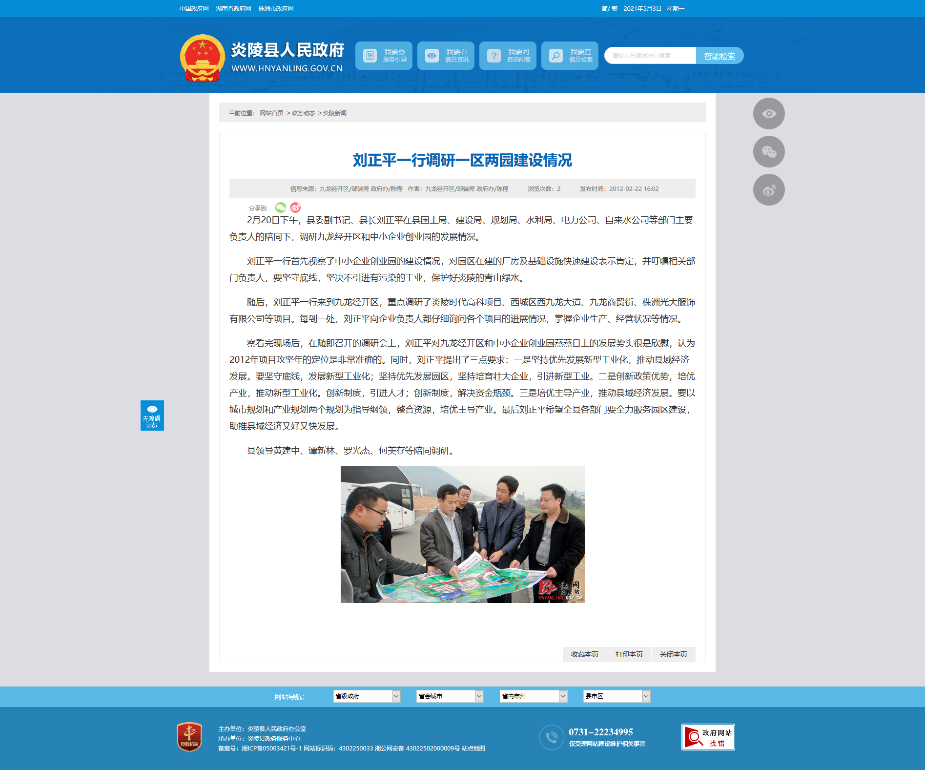 2月20日下午,县委副书记、县长刘正平在县国土局、建设局、规划局、水利局、电力公司、自来水公司等部门主要负责人的陪同下,调研九龙经开区和中小企业创业园的发展情况。