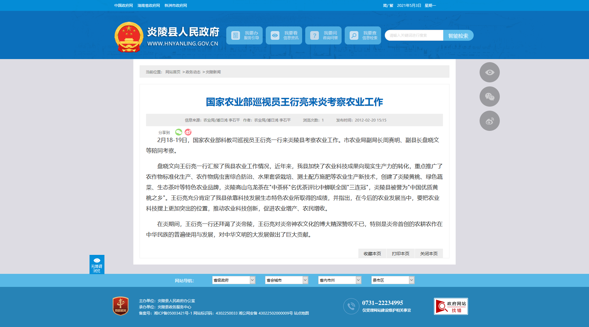 盘晓文向王衍亮一行汇报了我县农业工作情况,近年来,我县加快了农业科技成果向现实生产力的转化,重点推广了农作物标准化生产、农作物病虫害综合防治、水果套袋栽培、测土配方施肥等农业生产新技术,创建了炎陵黄桃、绿色蔬菜、生态茶叶等特色农业品牌,炎陵高山乌龙茶在"中茶杯"名优茶评比中蝉联全国"三连冠",炎陵县被誉为"中国优质黄桃之乡"。王衍亮充分肯定了我县依靠科技发展生态特色农业所取得的成绩,并指出,在今后的农业发展当中,要把农业科技摆上更加突出的位置,推动农业科技创新,促进农业增产、农民增收。