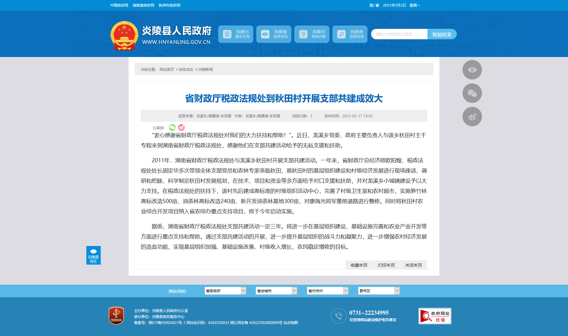 2011年.湖南省财政厅税政法规处与龙溪乡秋田村开展支部共建活动。一年来,省财政厅总经济师欧阳煌、税政法规处处长胡定华多次带领全体支部党员和农林专家亲临秋田,就秋田村的基层组织建设和村级经济发展进行现场座谈、调研和把脉,科学制定秋田村发展规划,在技术、项目和资金等多方面给予对口支援和扶助,并对龙溪乡小城镇建设予以大力支持。在税政法规处的扶持下,该村先后建成高标准的村级组织活动中心,完善了村级卫生室和农村超市,实施笋竹林高标改造500亩、油茶林高标改造240亩、新开发油茶林基地300亩,对廖海光将军墓前道路进行整修。同时将秋田村农业综合开发项目纳入省农综办重点支持项目,将于今年启动实施。