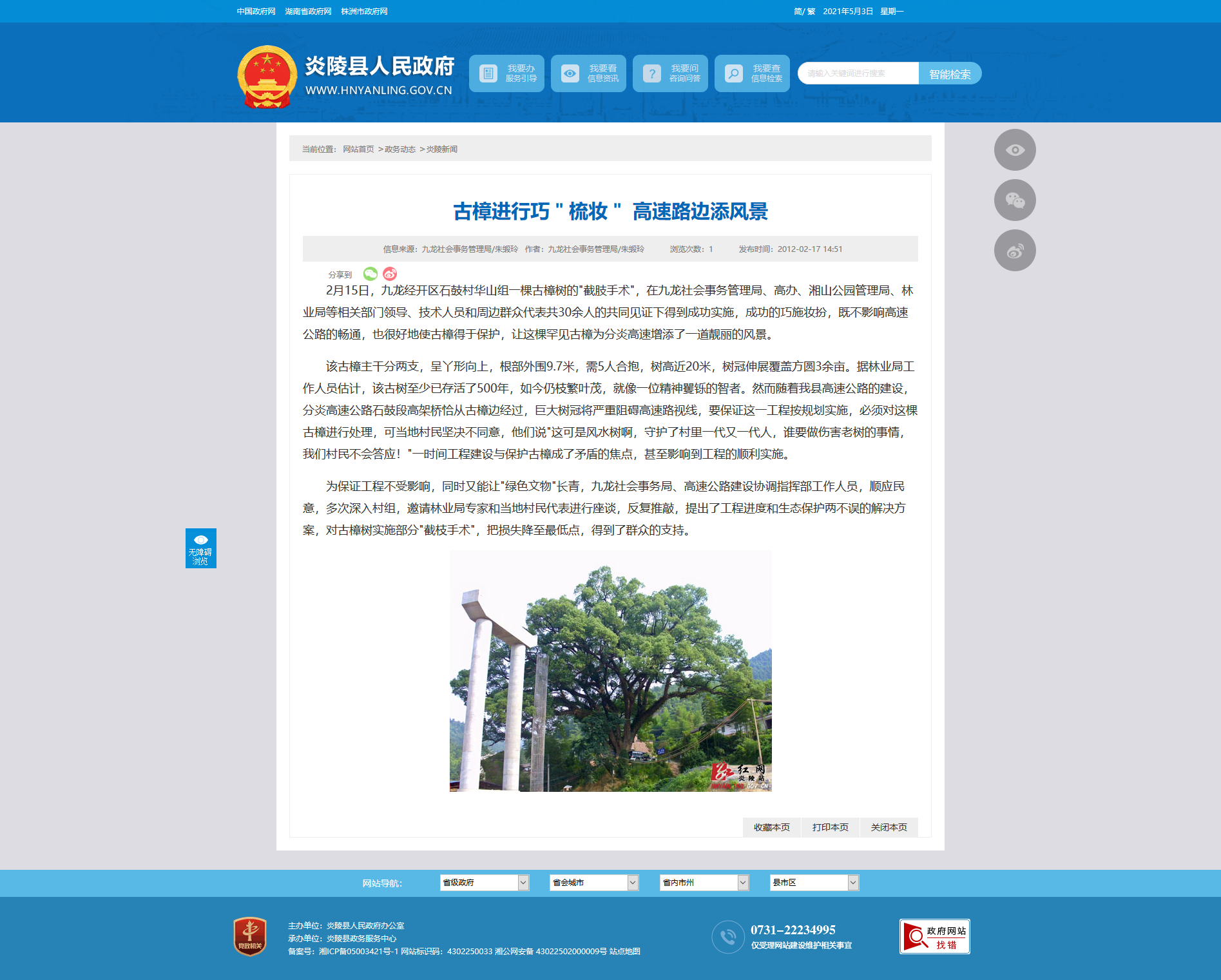 2月15日,九龙经开区石鼓村华山组一棵古樟树的"截肢手术",在九龙社会事务管理局、高办、湘山公园管理局、林业局等相关部门领导、技术人员和周边群众代表共30余人的共同见证下得到成功实施,成功的巧施妆扮,既不影响高速公路的畅通,也很好地使古樟得于保护,让这棵罕见古樟为分炎高速增添了一道靓丽的风景。