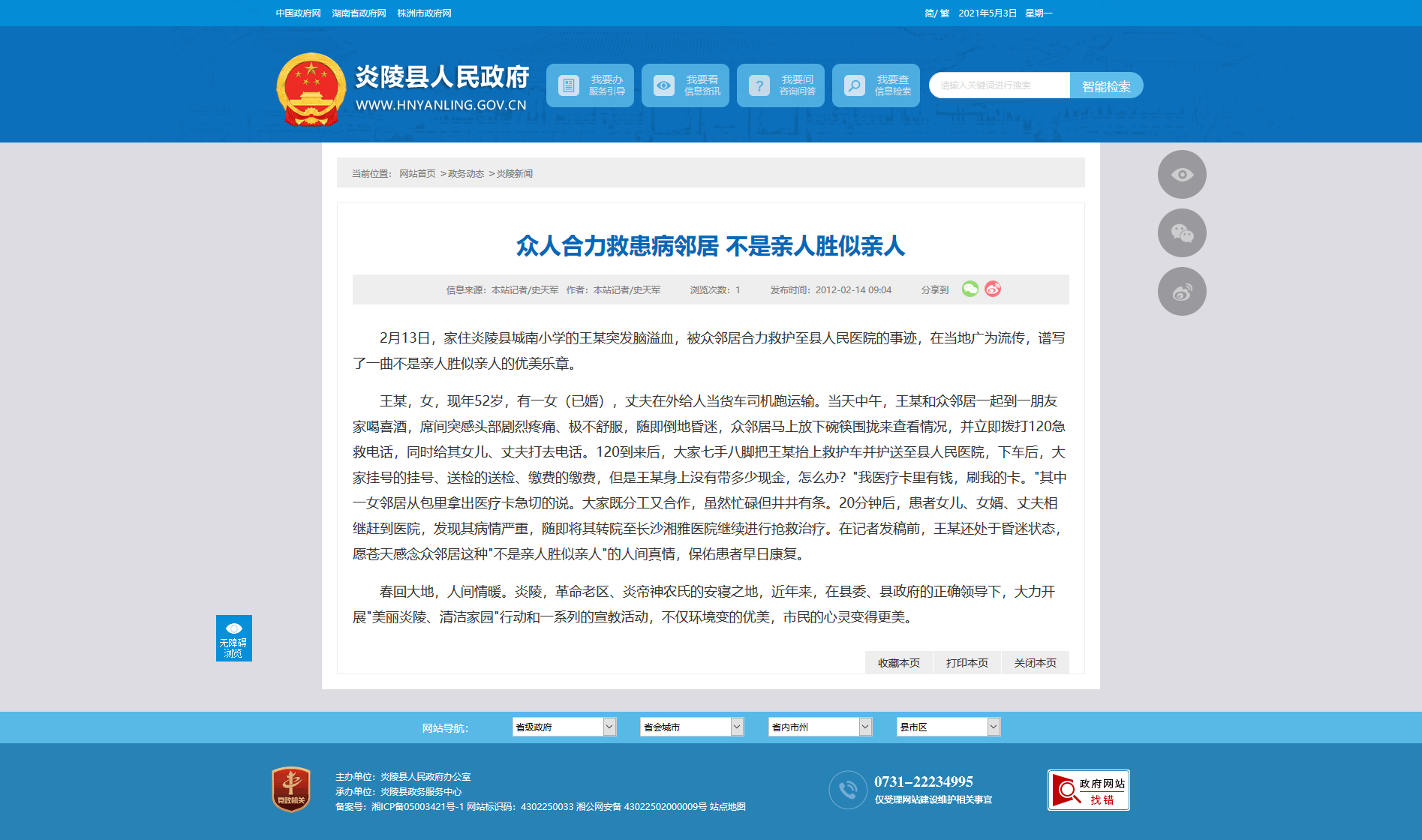 2月13日,家住炎陵县城南小学的王某突发脑溢血,被众邻居合力救护至县人民医院的事迹,在当地广为流传,谱写了一曲不是亲人胜似亲人的优美乐章。