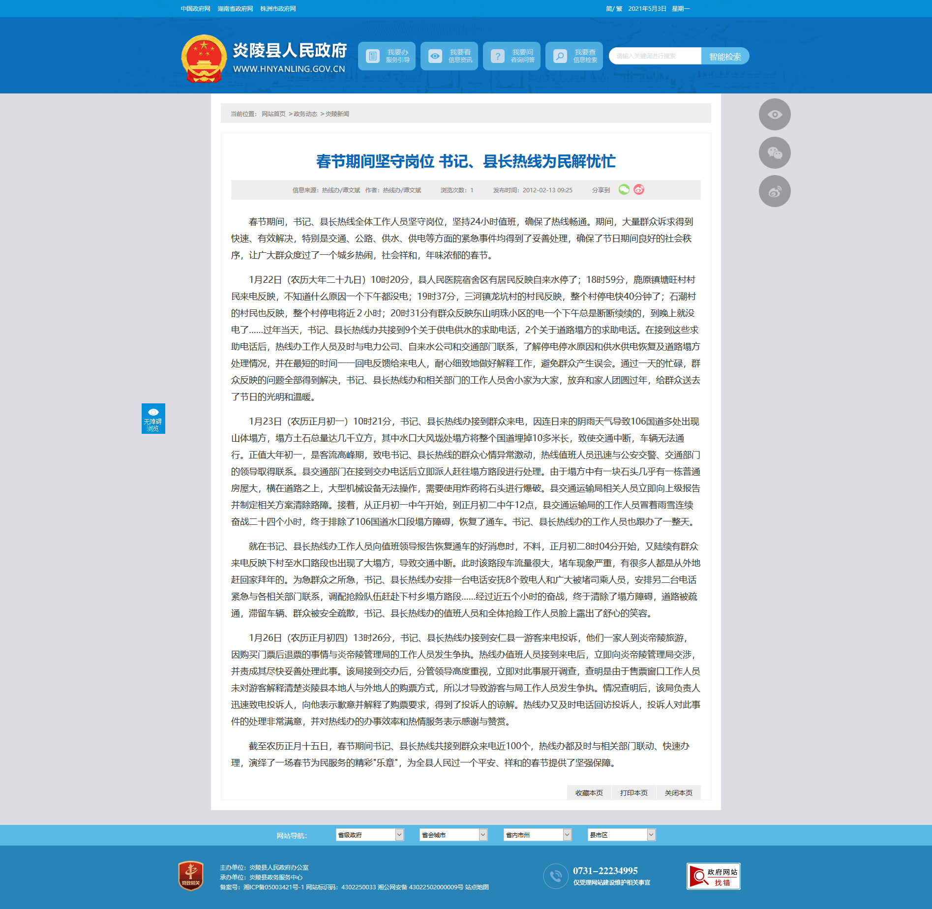 春节期间,书记、县长热线全体工作人员坚守岗位,坚持24小时值班,确保了热线畅通。期间,大量群众诉求得到快速、有效解决,特别是交通、公路、供水、供电等方面的紧急事件均得到了妥善处理,确保了节日期间良好的社会秩序,让广大群众度过了一个城乡热闹,社会祥和,年味浓郁的春节。