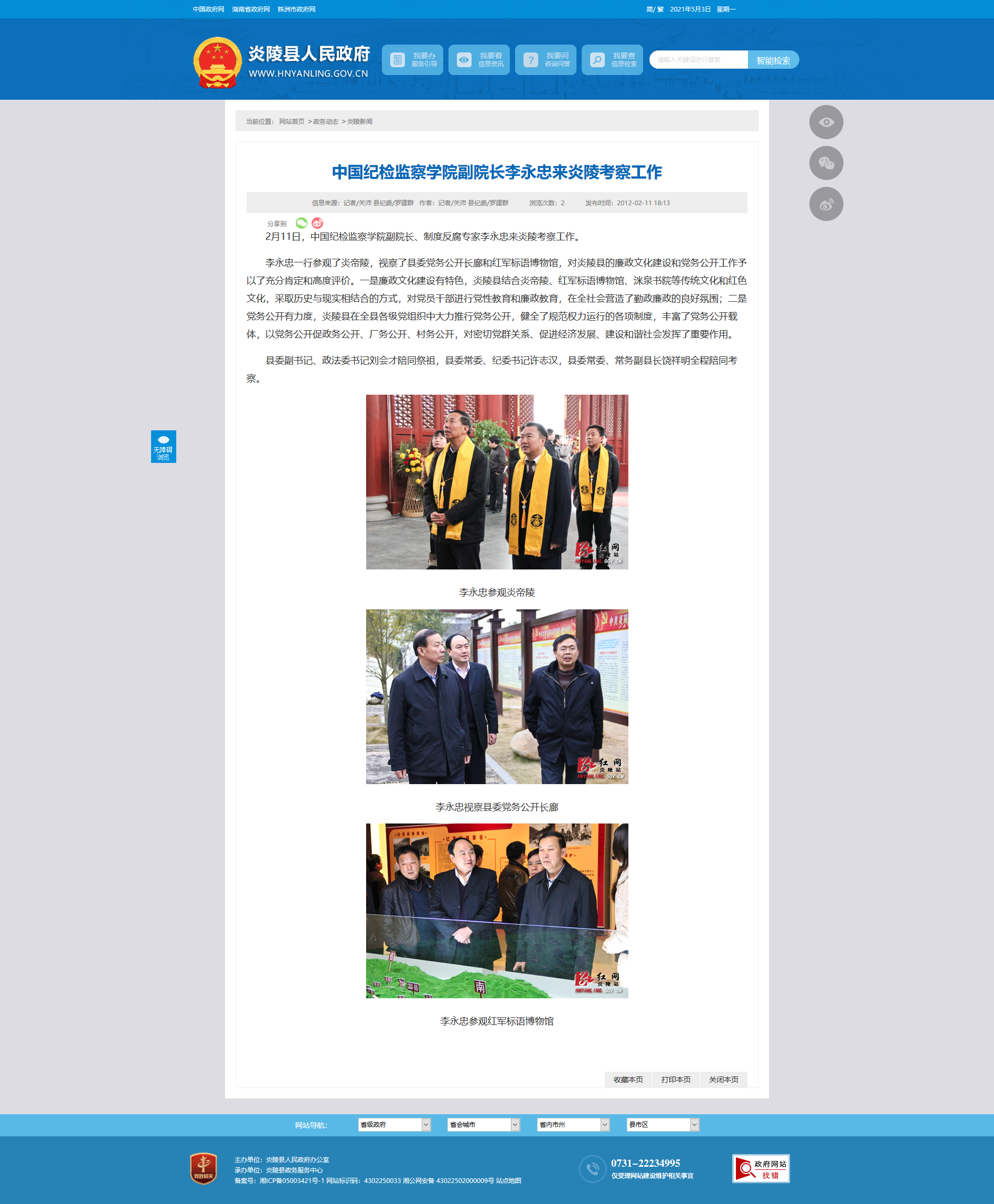 李永忠一行参观了炎帝陵,视察了县委党务公开长廊和红军标语博物馆,对炎陵县的廉政文化建设和党务公开工作予以了充分肯定和高度评价。一是廉政文化建设有特色,炎陵县结合炎帝陵、红军标语博物馆、洣泉书院等传统文化和红色文化,采取历史与现实相结合的方式,对党员干部进行党性教育和廉政教育,在全社会营造了勤政廉政的良好氛围;二是党务公开有力度,炎陵县在全县各级党组织中大力推行党务公开,健全了规范权力运行的各项制度,丰富了党务公开载体,以党务公开促政务公开、厂务公开、村务公开,对密切党群关系、促进经济发展、建设和谐社会发挥了重要作用。