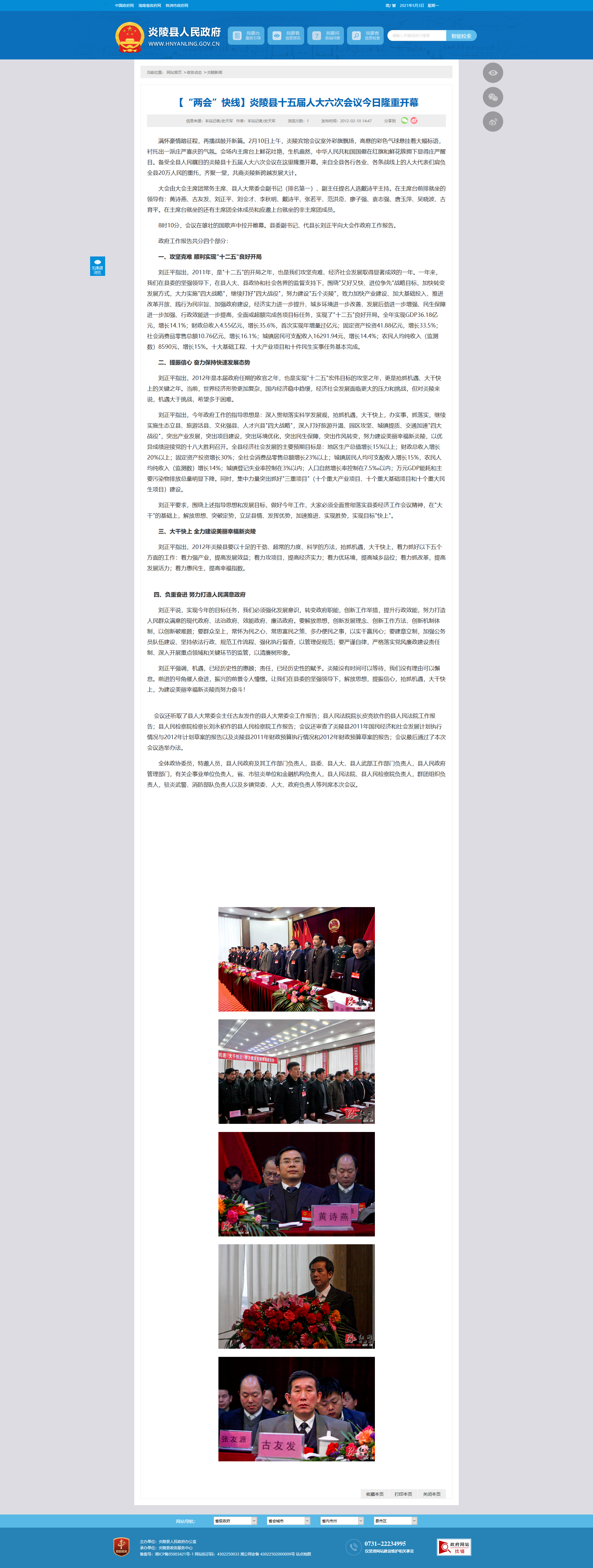 刘正平指出,2011年,是"十二五"的开局之年,也是我们攻坚克难、经济社会发展取得显著成效的一年。一年来,我们在县委的坚强领导下,在县人大、县政协和社会各界的监督支持下,围绕"又好又快、进位争先"战略目标,加快转变发展方式,大力实施"四大战略",继续打好"四大战役",努力建设"五个炎陵",致力加快产业建设、加大基础投入、推进改革开放、践行为民宗旨、加强政府建设,经济实力进一步提升、城乡环境进一步改善、发展后劲进一步增强、民生保障进一步加强、行政效能进一步提高,全面或超额完成各项目标任务,实现了"十二五"良好开局。全年实现GDP36.18亿元,增长14.1%;财政总收入4.55亿元,增长35.6%,首次实现年增量过亿元;固定资产投资41.88亿元,增长33.5%;社会消费品零售总额10.76亿元,增长16.1%;城镇居民可支配收入16291.94元,增长14.4%;农民人均纯收入(监测数)8590元,增长15%。十大基础工程、十大产业项目和十件民生实事任务基本完成。