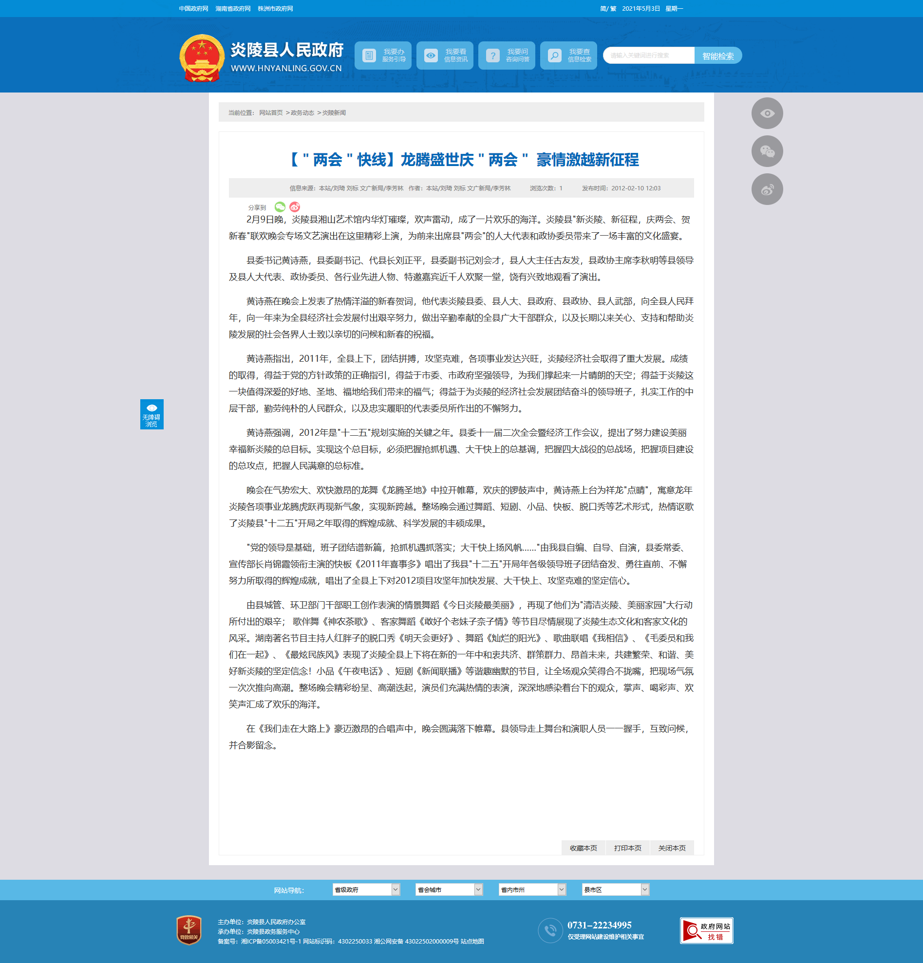 黄诗燕指出,2011年,全县上下,团结拼搏,攻坚克难,各项事业发达兴旺,炎陵经济社会取得了重大发展。成绩的取得,得益于党的方针政策的正确指引,得益于市委、市政府坚强领导,为我们撑起来一片晴朗的天空;得益于炎陵这一块值得深爱的好地、圣地、福地给我们带来的福气;得益于为炎陵的经济社会发展团结奋斗的领导班子,扎实工作的中层干部,勤劳纯朴的人民群众,以及忠实履职的代表委员所作出的不懈努力。