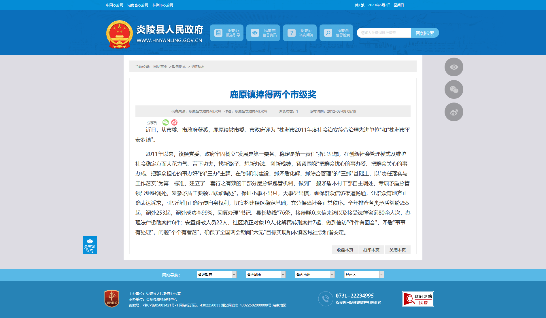 近日,从市委、市政府获悉,鹿原镇被市委、市政府评为 "株洲市2011年度社会治安综合治理先进单位"和"株洲市平安乡镇"。