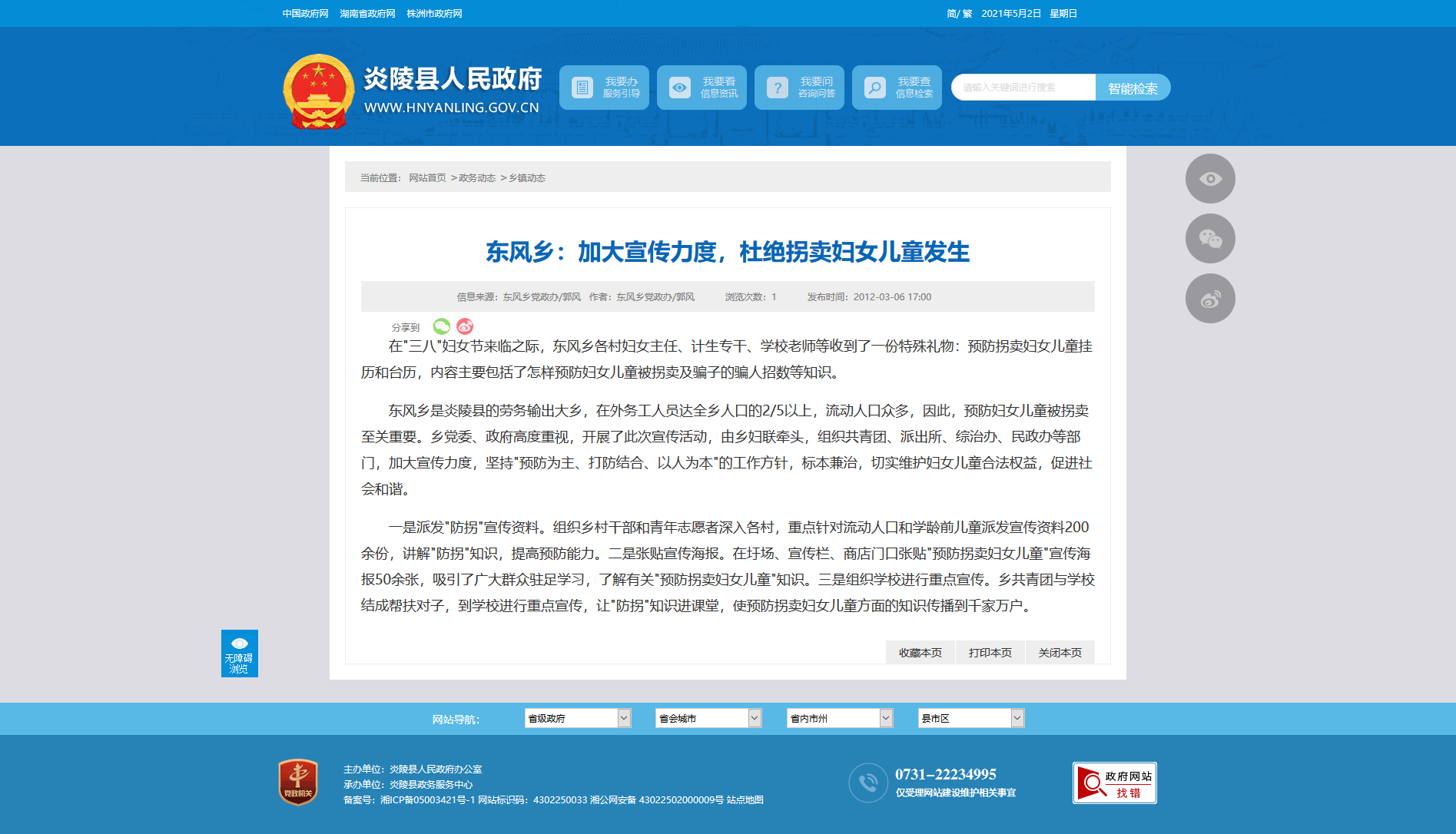 东风乡是炎陵县的劳务输出大乡,在外务工人员达全乡人口的2/5以上,流动人口众多,因此,预防妇女儿童被拐卖至关重要。乡党委、政府高度重视,开展了此次宣传活动,由乡妇联牵头,组织共青团、派出所、综治办、民政办等部门,加大宣传力度,坚持"预防为主、打防结合、以人为本"的工作方针,标本兼治,切实维护妇女儿童合法权益,促进社会和谐。