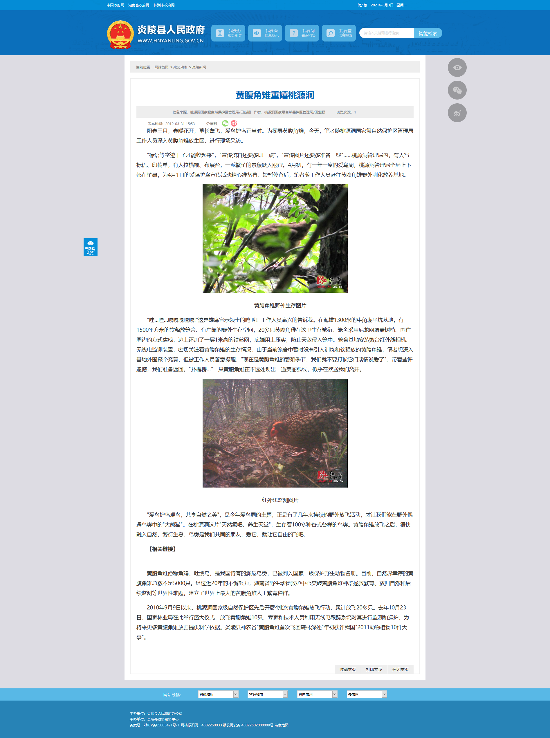 阳春三月,春暖花开,草长莺飞,爱鸟护鸟正当时。为探寻黄腹角雉,今天,笔者随桃源洞国家级自然保护区管理局工作人员深入黄腹角雉放生区,进行现场采访。