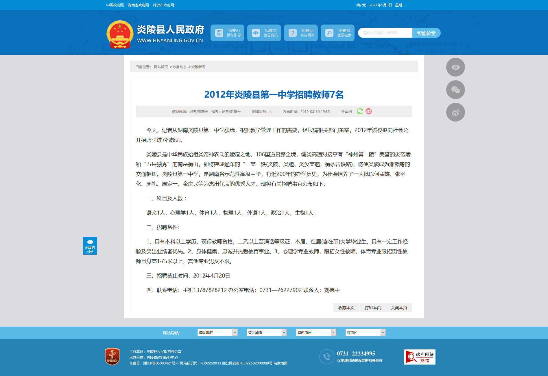 今天,记者从湖南炎陵县第一中学获悉,根据教学管理工作的需要,经报请相关部门备案,2012年该校拟向社会公开招聘引进7名教师。