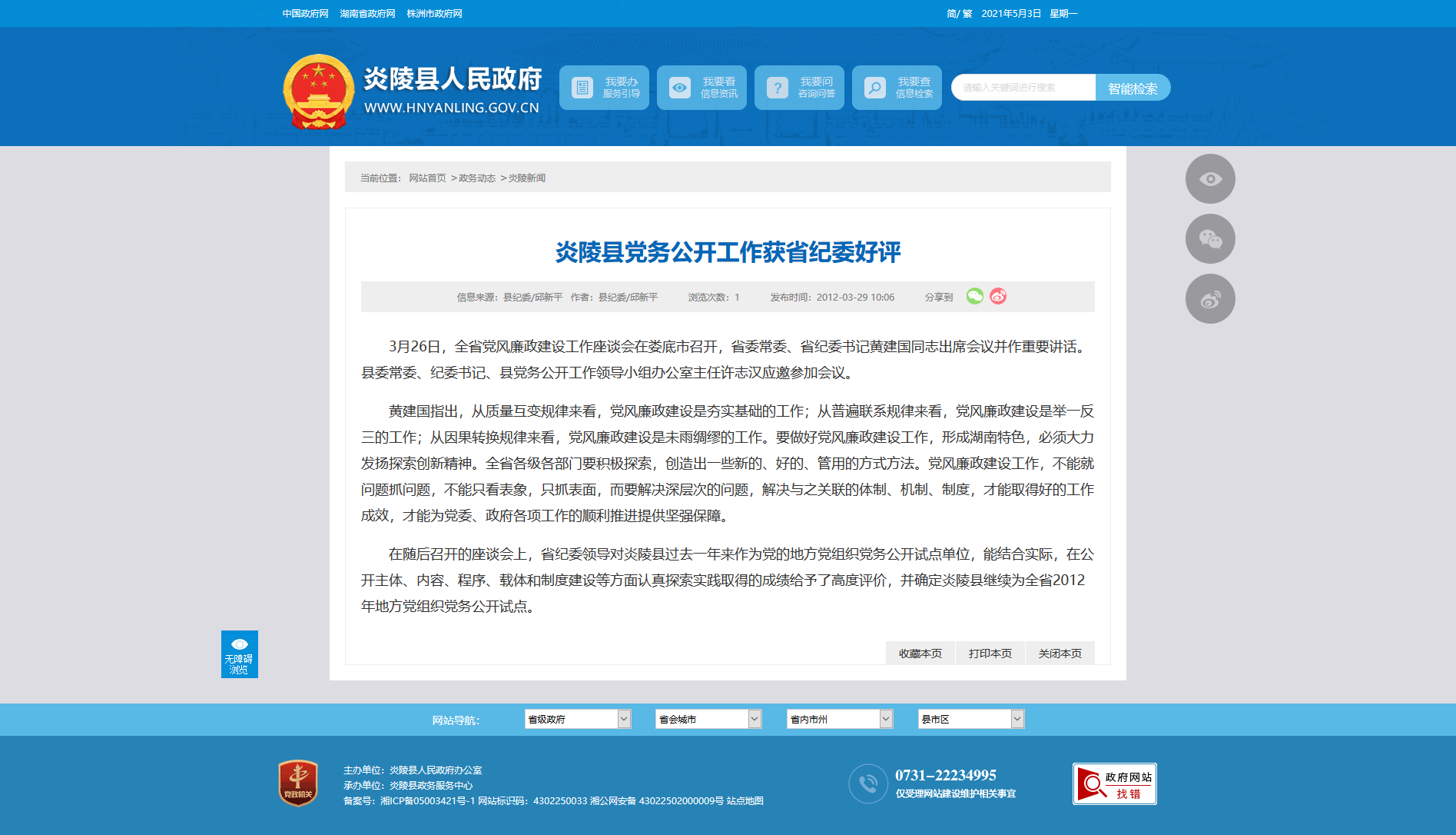 在随后召开的座谈会上,省纪委领导对炎陵县过去一年来作为党的地方党组织党务公开试点单位,能结合实际,在公开主体、内容、程序、载体和制度建设等方面认真探索实践取得的成绩给予了高度评价,并确定炎陵县继续为全省2012年地方党组织党务公开试点。