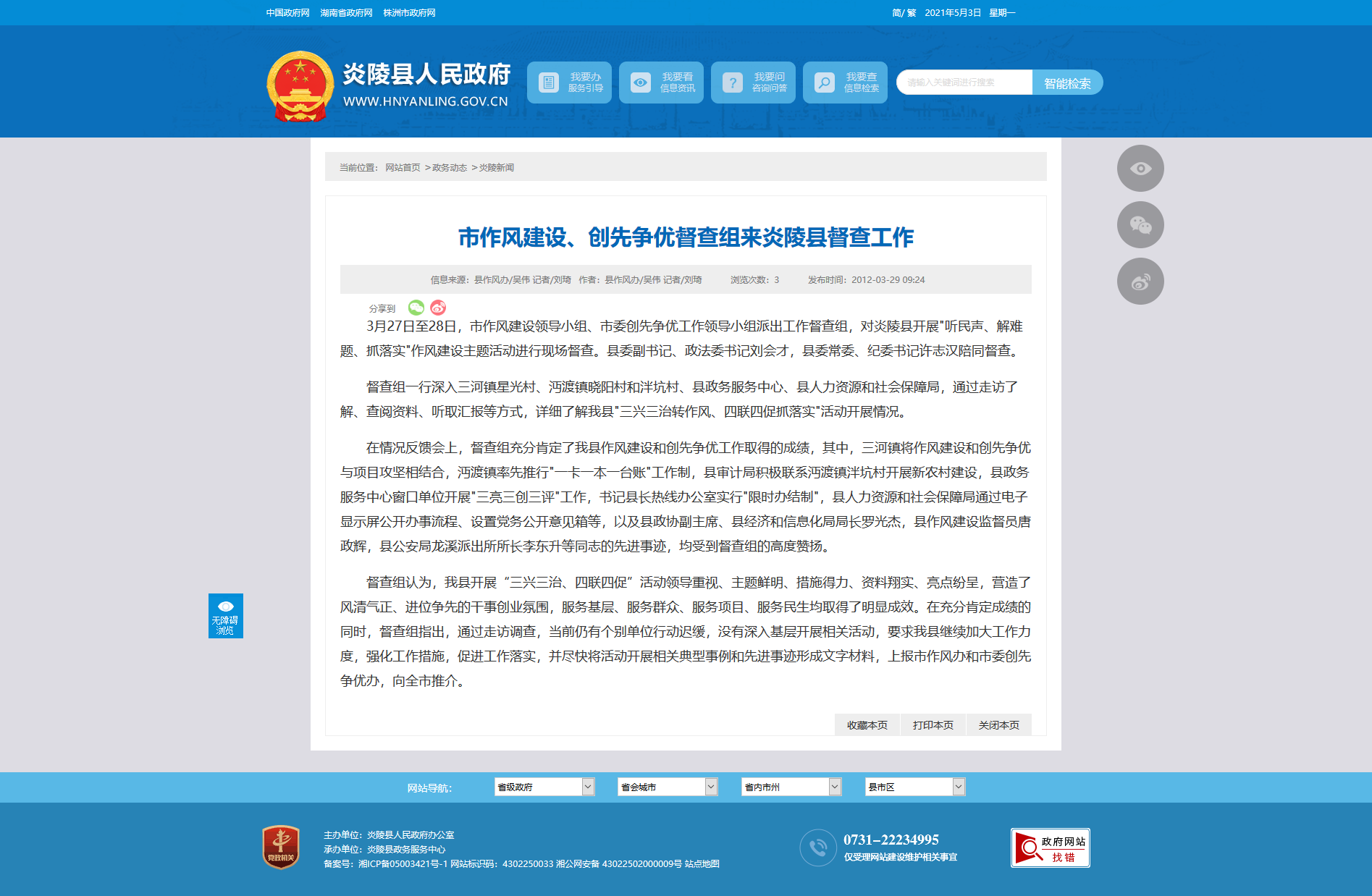 3月27日至28日,市作风建设领导小组、市委创先争优工作领导小组派出工作督查组,对炎陵县开展"听民声、解难题、抓落实"作风建设主题活动进行现场督查。县委副书记、政法委书记刘会才,县委常委、纪委书记许志汉陪同督查。