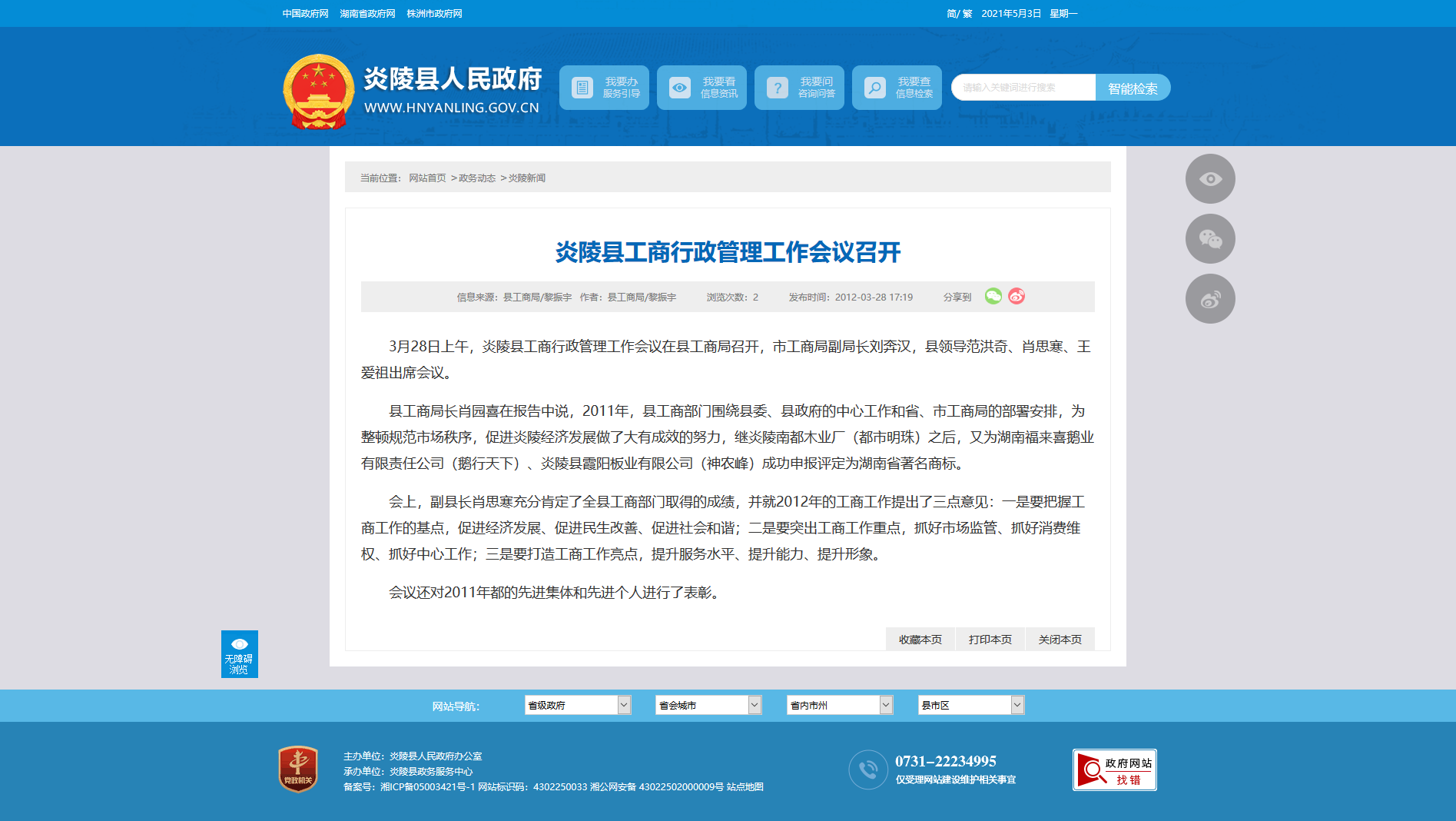 县工商局长肖园喜在报告中说,2011年,县工商部门围绕县委、县政府的中心工作和省、市工商局的部署安排,为整顿规范市场秩序,促进炎陵经济发展做了大有成效的努力,继炎陵南都木业厂(都市明珠)之后,又为湖南福来喜鹅业有限责任公司(鹅行天下)、炎陵县霞阳板业有限公司(神农峰)成功申报评定为湖南省著名商标。