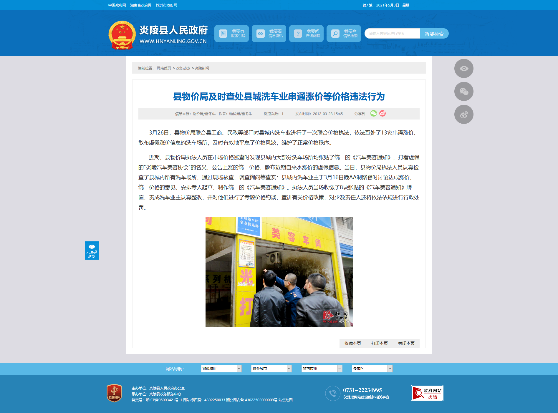 3月26日,县物价局联合县工商、民政等部门对县城内洗车业进行了一次联合价格执法,依法查处了13家串通涨价、散布虚假涨价信息的洗车场所,及时有效地平息了价格风波,维护了正常价格秩序。