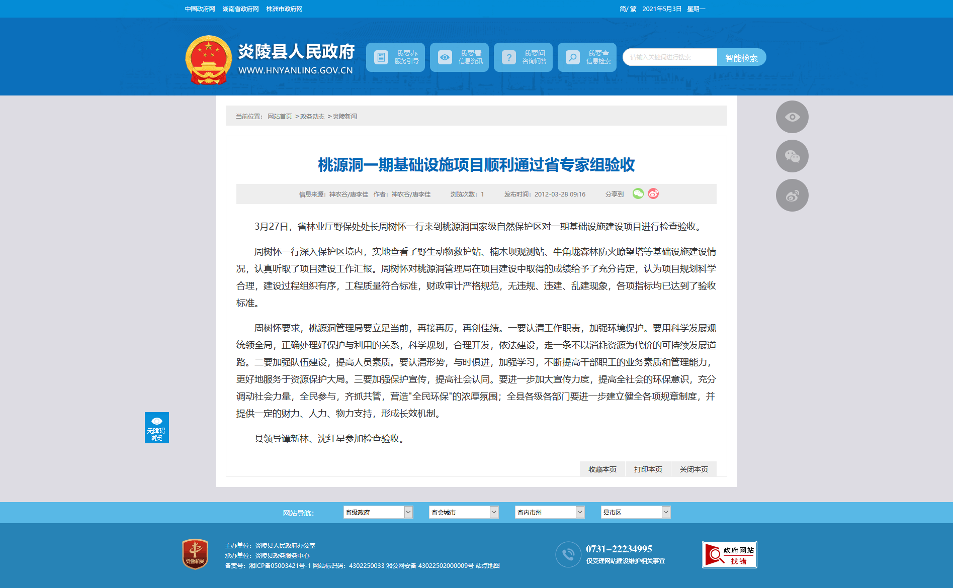 3月27日,省林业厅野保处处长周树怀一行来到桃源洞国家级自然保护区对一期基础设施建设项目进行检查验收。
