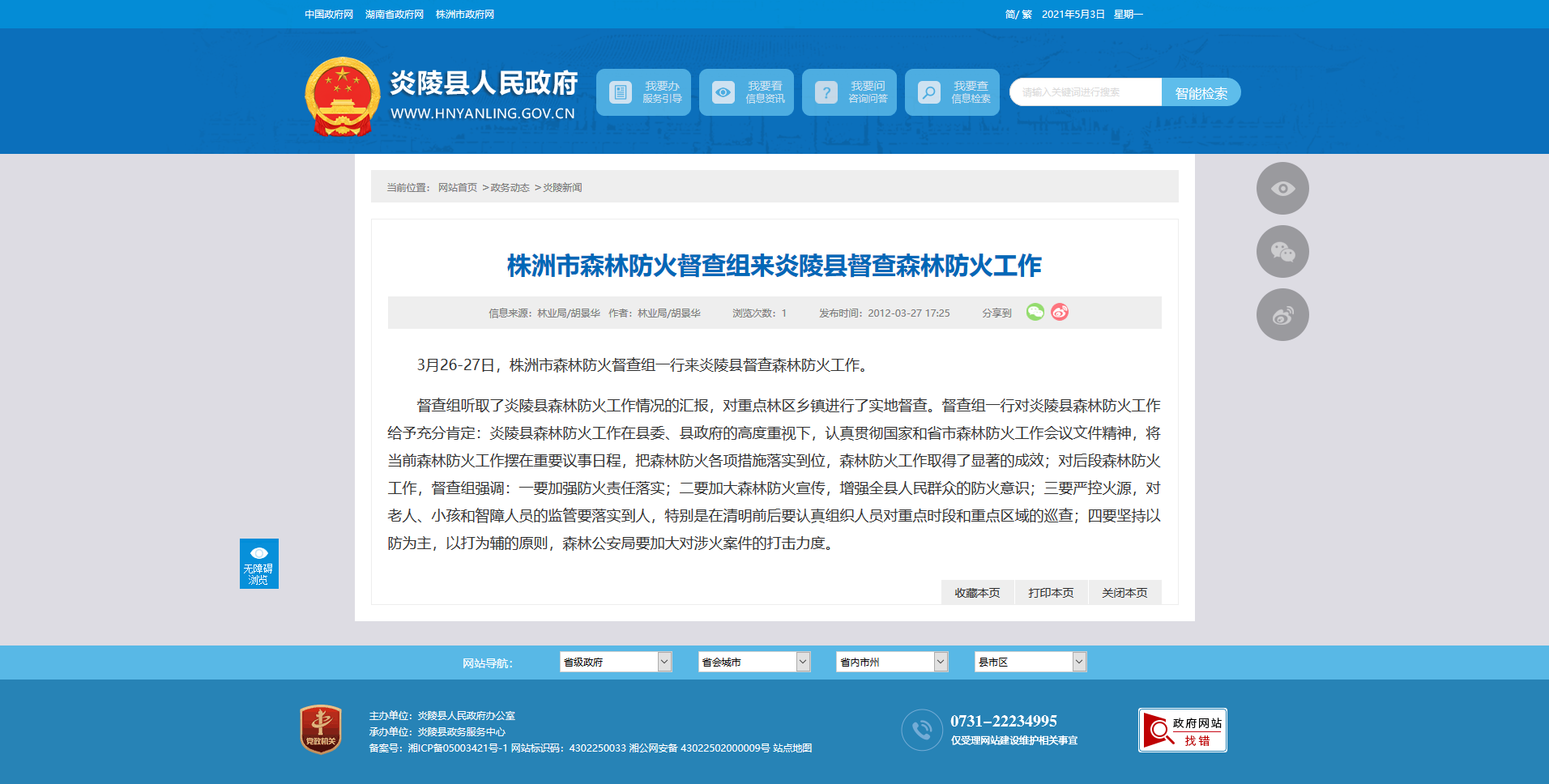 3月26-27日,株洲市森林防火督查组一行来炎陵县督查森林防火工作。