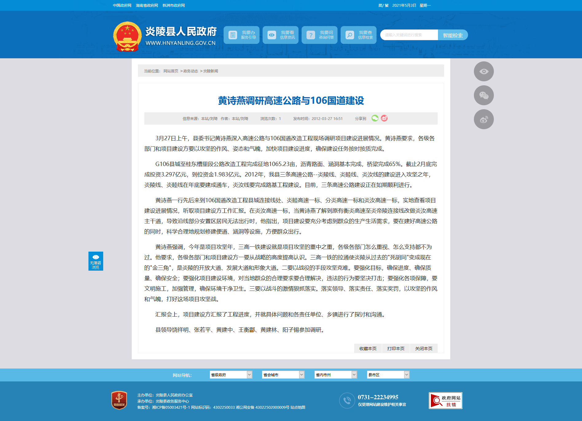 G106县城至桂东槽里段公路改造工程完成征地1065.23亩,沥青路面、涵洞基本完成,桥梁完成65%。截止2月底完成投资3.297亿元,到位资金1.983亿元。2012年,我县三条高速公路--炎陵线、炎睦线、炎汝线的建设进入攻坚之年,炎陵线、炎睦线在年底要建成通车,炎汝线要完成路基工程建设。目前,三条高速公路建设正在如期顺利进行。