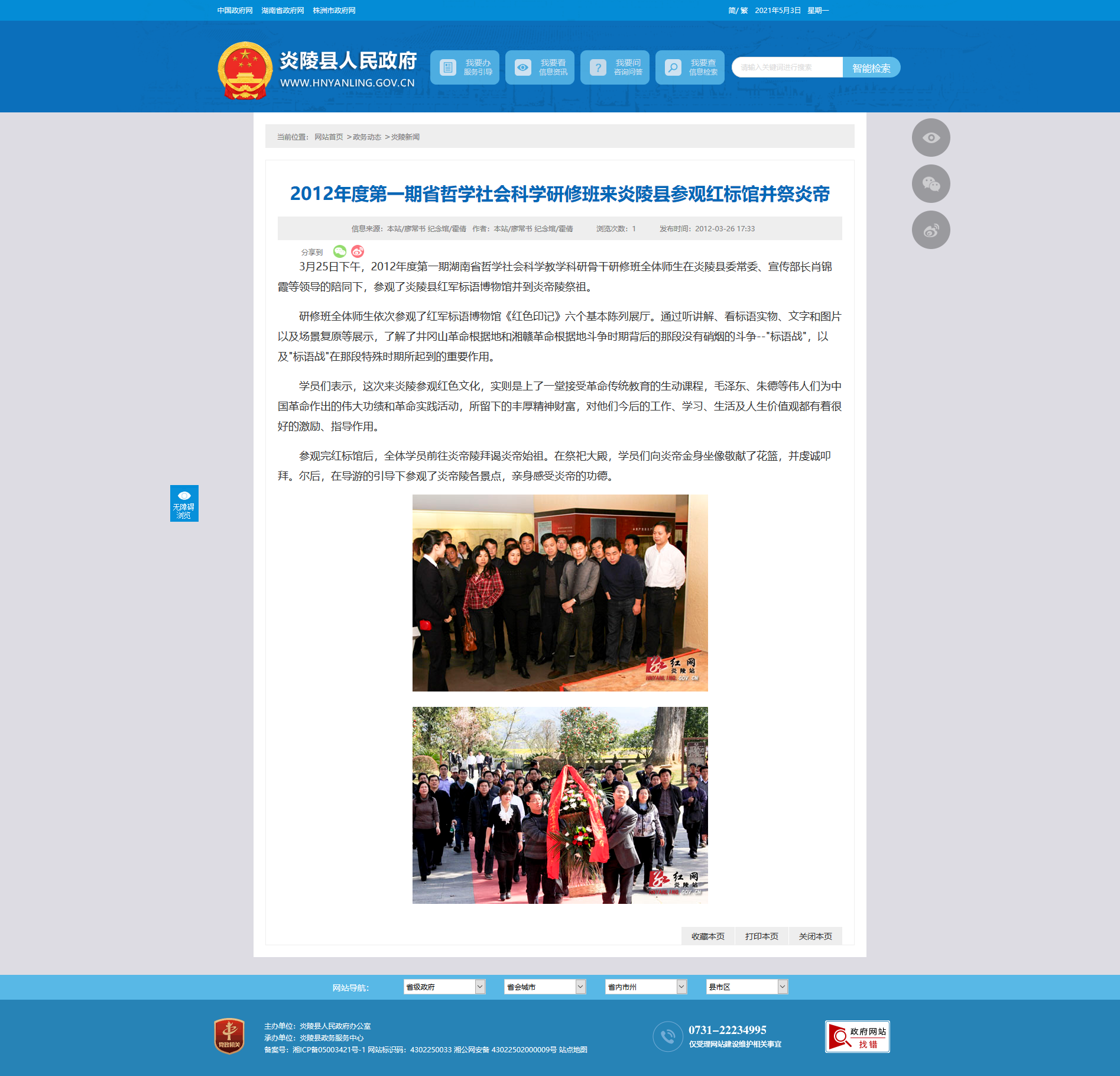 3月25日下午,2012年度第一期湖南省哲学社会科学教学科研骨干研修班全体师生在炎陵县委常委、宣传部长肖锦霞等领导的陪同下,参观了炎陵县红军标语博物馆并到炎帝陵祭祖。