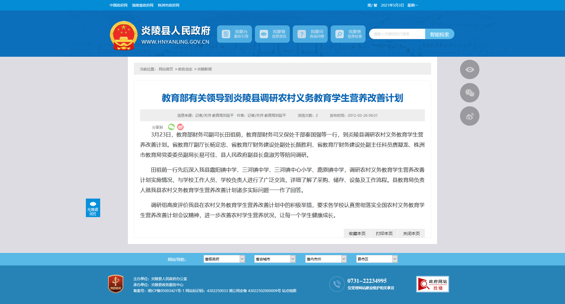 3月23日,教育部财务司副司长田祖荫,教育部财务司义保处干部秦国强等一行,到炎陵县调研农村义务教育学生营养改善计划。省教育厅副厅长杨定忠、省教育厅财务建设处副处长颜胜利、省教育厅财务建设处副主任科员唐凝龙、株洲市教育局党委委员副局长易可佳、县人民政府副县长盘淑芳等陪同调研。