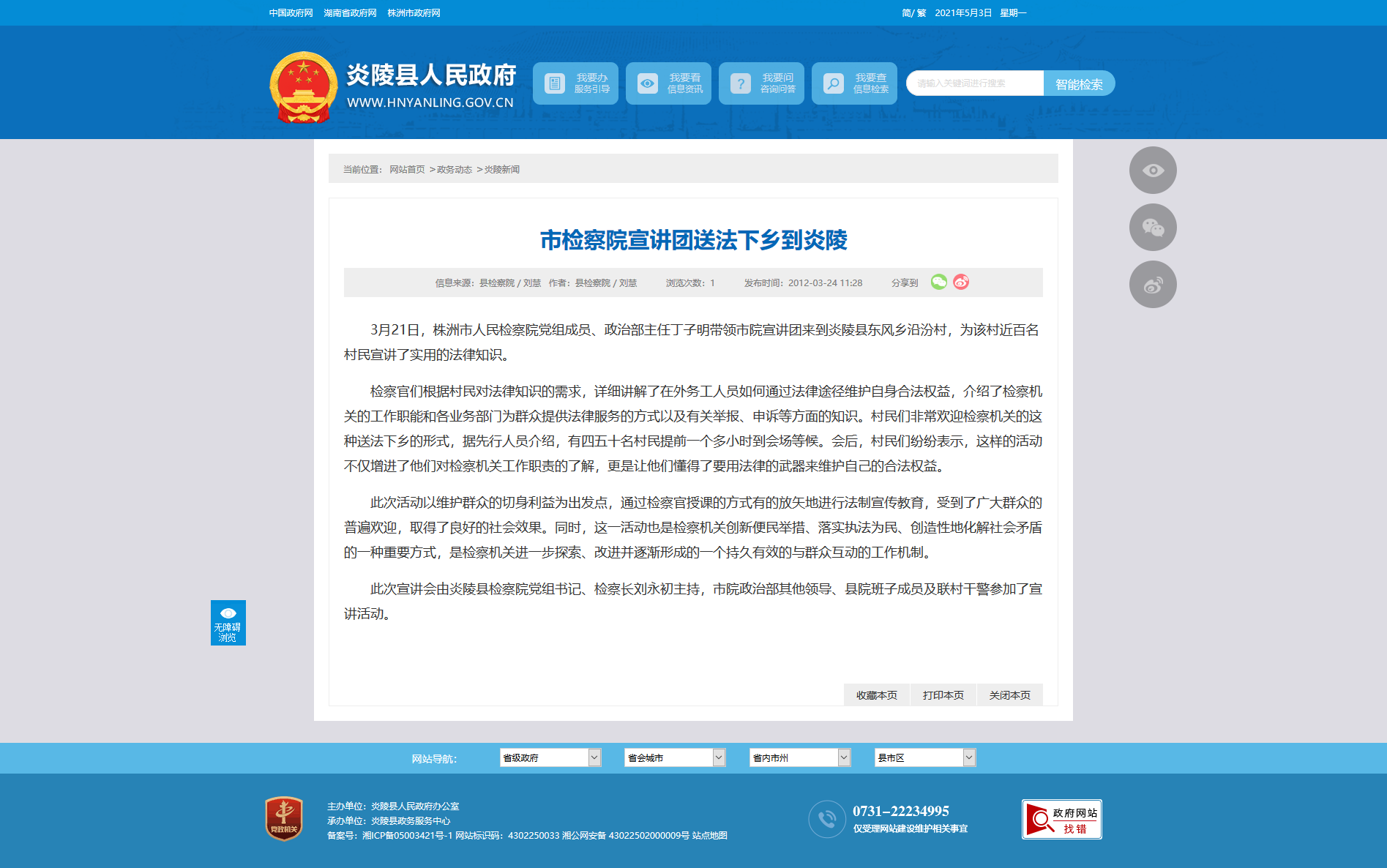 3月21日,株洲市人民检察院党组成员、政治部主任丁子明带领市院宣讲团来到炎陵县东风乡沿汾村,为该村近百名村民宣讲了实用的法律知识。
